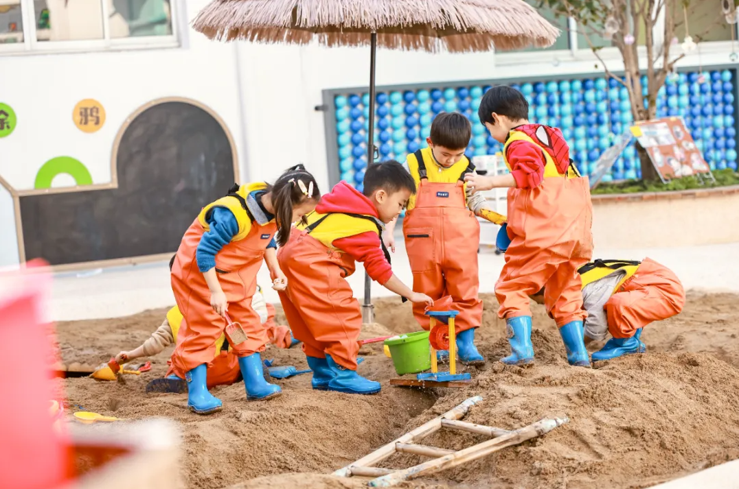 这一方天地不仅是游戏场域,更是生活教育的实践课堂。孩子们在这里学习自主整理工具、穿脱连体衣,小小的沙水区成为培养自理能力的天然教场。