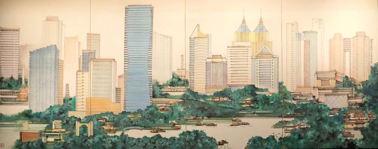 在这里,既有《浦东》《初心》等城市题材代表作,也有《印象普陀》《M50创意园区》等为普陀量身打造的新作。其中,《浦东》以恢弘的构图展现了上海的城市天际线,东方明珠、上海中心等地标以山水笔墨的形式傲然挺立,郁郁葱葱间,既透着现代都市的磅礴气势,又不失传统山水画的意境,显出桃花源般的诗意,带来新鲜感;《初心》则取中共一大会址一角,以标志的上海元素梧桐树作为画面的前景,烘托还原出一大会址特有的氛围,讲述着这里的故事与精神力量。
