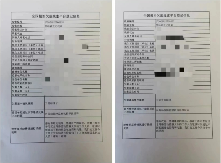 2024年2月8日上午,普陀区人社局执法大队通过“全国根治欠薪线索反映平台”接收到两条特殊的欠薪线索,没有欠薪人数与金额,但非常认真地写道:“感谢尊敬的领导,感谢庄严的政府,感谢上海市普陀区志丹路劳动监察大队的工作人员,这段时候通过不断的跟总包协商和沟通,我们的工资今天终于全部结清打给我们了!万分感谢国家执法人员!谢谢!谢谢!” 元旦过后,普陀区某建筑工地的农民工通过“全国根治欠薪线索反映平台”、“12333”咨询服务热线、“12345”市民服务热线等渠道反映在该工地被拖欠工资问题,涉及近百人200多万元的金额。大队领导高度重视,安排执法员加强协调和督促,要求从快从速核处。 经了解,由于该项目建设方的资金周转出现困难,总包方收不到款项,导致无法及时向下属劳务分包方支付资金,工程量核算及工资核对等工作也出现不同程度的停滞和延后。为确保农民工兄弟能及时足额拿到应得的工资报酬安心返乡过年,大队联合区建管中心多次沟通协调,要求总包方牵头加速核对工程量及工人工资,并出资先行垫付,最终在过年前一天(也就是2月8日)将工资全部结清。拿到工资的农民工不知道通过何种途径表示谢意,于是又反映了这两条特殊的“欠薪线索”。 今年以来,大队贯彻落实上级有关决策部署,扎实做好岁末年初保障农民工工资支付工作,认真开展根治欠薪冬季专项行动,加强隐患排查,依法分类处置,加大对各类欠薪案件的查处力度。大家发扬吃苦耐劳、敢打硬仗的精神,加班加点,忘我工作,切实提升欠薪问题化解效率,有效维护了区域劳动关系的稳定和谐。两条特殊“欠薪线索”中写下的那句“谢谢”就是对大队工作的最高褒奖。