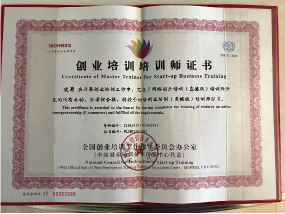 凭借专业的授课水平和扎实的服务成效,普陀分团专家凌菊成功获得由中国就业培训技术指导中心颁发的网络创业培训(直播版)培训师证书,这一荣誉既是对其专业能力的肯定,也充分彰显了普陀分团专家团队的专业实力与责任担当。