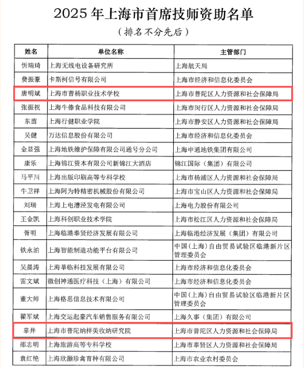 “技能照亮前程”丨普陀区新增2名优秀高技能人才获上海市首席技师资助! 2026年01月12日 来源: 普陀人社
