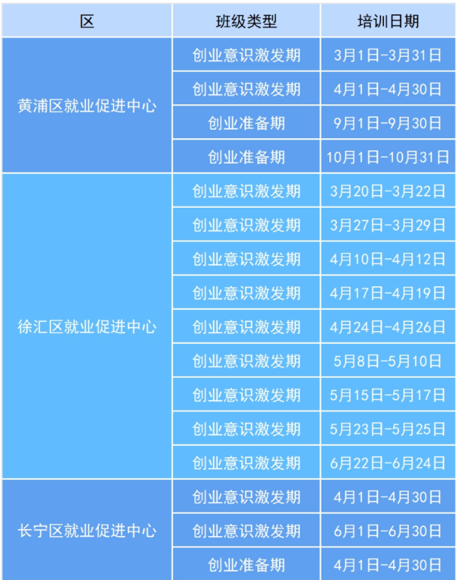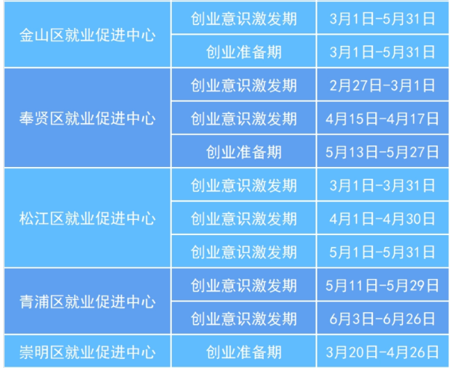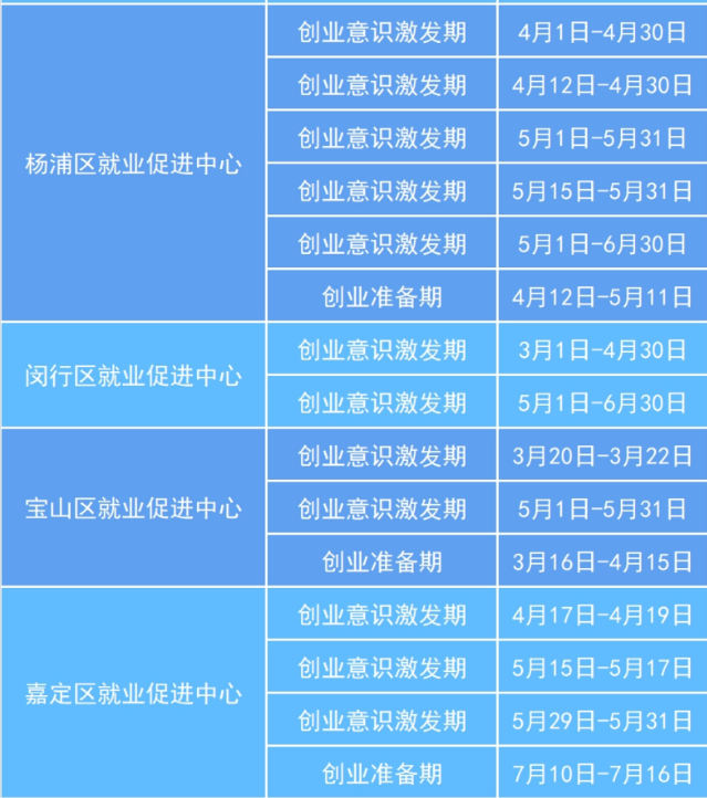 为提升劳动者就业创业能力,促进劳动者成功创业并通过创业带动就业,本市发布了《上海市人力资源和社会保障局 上海市财政局关于加强创业培训提升全过程创业能力的实施意见》(沪人社规〔2025〕30号)文件,遵循创业活动的规律,开展覆盖创业意识激发期、创业准备期、创业初创期、创业发展期等不同阶段的创业培训。 一、创业意识激发期、创业准备期 培训主体:各区就业促进中心 培训对象:本市有创业能力提升意愿和培训需求的各类劳动者,重点面向本市各类职业院校和高校在校学生、退役军人、残疾人和即将刑满释放人员等群体。 培训费用:免费(不含食宿) 课程介绍: (一)标准课程 产生你的企业想法(GYB):旨在帮助创业者了解什么是企业和企业想法,分析评估是否适合创业,掌握产生企业想法的方法,并筛选出适合自己的创业项目。 创办你的企业(SYB):旨在帮助创业者在培训过程中演练开办企业的各个步骤,完成自己的创业计划书,建立有生存能力的小微企业。 (二)精品课程 聚焦上海重点产业、战略性新兴产业和区域特色资源,开展适配创业者实际需求的创业培训精品课程,现已开发聚焦跨境电商、数字文创、科技创业等行业,针对退役军人、社区创业者等重点群体的精品课程,更多课程正在持续建设中。 二、创业初创期 培训主体:具有相关资质的创业培训机构 培训对象:本市有意改善创业组织经营情况的已创业者 培训费用:按市场价格定价,对于获得创业初创期培训合格证书的,给予个人培训费补贴1800元/人。 课程介绍: 改善你的企业IYB:旨在帮助小微企业主学习制订和实施市场营销计划、核算产品成本、有效控制采购投入、管理企业存货、建立基本的记账体系,形成企业改善计划,提升企业经营管理能力。 三、创业发展期 培训主体:市、区就业促进中心 培训对象:有意扩大企业规模的创业者,重点面向已获得创业大赛奖项或风险投资机构投资的企业负责人 课程介绍: 扩大你的企业EYB:旨在帮助企业主系统地学习前沿的企业战略管理课程,围绕企业现状分析、战略路径规划、核心竞争力提升等核心内容,制订一套可行的企业增长战略计划。 马兰花创业培训2026年上半年开班计划 (以各区实际举办为准) 报名方式: 有培训意向的学员可联系各区公共创业指导服务部门咨询报名,或扫描以下个人创业一件事二维码,点击“创业培训报名”在线提交培训需求,各区公共创业服务部门将主动联系,根据实际情况遴选通过后可参加培训。 2026年普陀区GYB培训班即将在3-4月火热开班 欢迎各位创业者积极报名参加 ↓ 有意向者可提前致电预留信息 ↓ 普陀区就业促进中心创业指导科 咨询电话:021-66118901 来源:上海市人力资源和社会保障