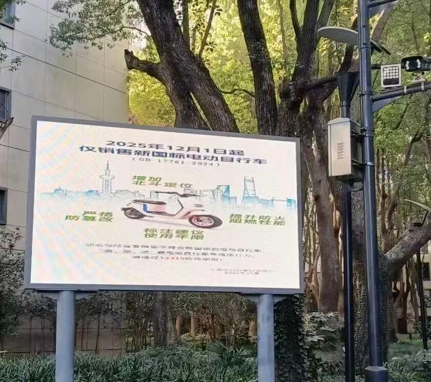 11月下旬以来,普陀区市场监管局加强对禁售旧国标电动自行车的宣传力度,在区内各大商圈、各委会和党群服务中心以及沿街的各类电子屏幕展示禁售旧国标车海报,向社会公众广泛宣传禁售旧国标车的规定。
