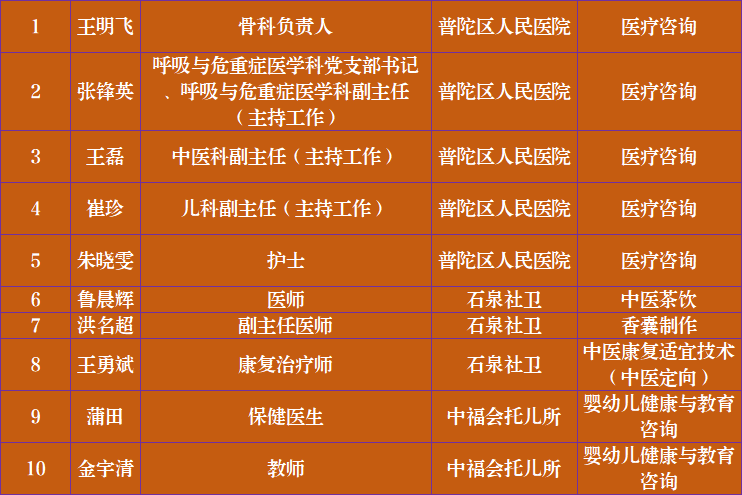 普陀区人民医院:健康咨询服务(测血压、呼吸科、骨科、儿科、中医科)。