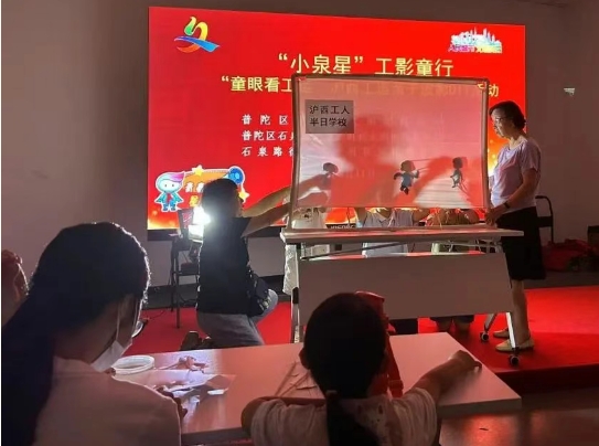 随后,一场略显生涩却充满真诚的皮影戏表演在现场上演。孩子们手持皮影,在幕布后演绎着沪西工运中沪西工人半日学校的经典片段 。“工人就是‘天’,我们要团结起来!”小演员们稚嫩却坚定的声音在展厅回荡,台下的观众们看得目不转睛,仿佛被带回到了那个热血沸腾的年代。