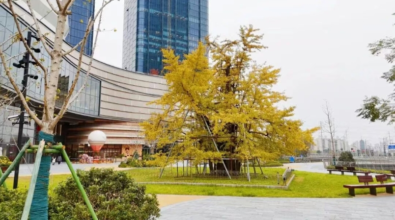 银杏树编号为0057,高18.5米,胸围2.7米,冠幅东西向和南北向各9米。别看眼前这棵银杏树嫩绿如新,其实历经了500多年的岁月变迁。为了让古树名木“老有所依”,街道林长办积极配合区林长办,指导古树养护单位园开公司,实施专业养护。2023年底,随着中海环宇城MAX的盛大开业,银杏树周边环境焕然一新,被精心打造成为银杏广场,为市民提供了一个休闲娱乐的优美空间,展现了宜居的生态环境,让古树与现代都市生活完美融合。