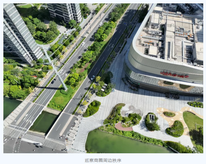 科技执法的智慧,更体现在处理经常出现的商铺跨门经营问题中。辖区内一家电动自行车商铺曾与执法人员“打游击”,进行跨门经营。在收到“触发式检查”提示后,店主试图撑开雨棚躲避侦查。没想到,执法人员采取了“空地结合”的新战术——空中,无人机持续锁定;地面,巡逻队员精准出击。最终,商户认识到问题的严重性,彻底整改。这种“非接触式”执法,实现了精准监管与优化营商环境的平衡。
