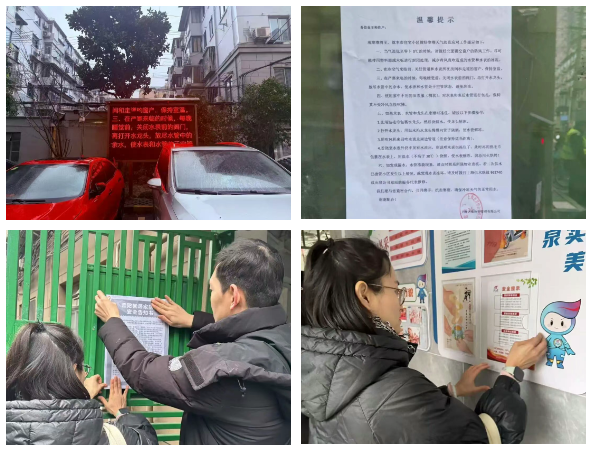 宣传动员到位。各居民区通过“线上+线下”多种渠道发布寒潮预警和防冻提醒。在小区公告栏、电子屏张贴或播放温馨提示,发放“三清三关”消防安全手册,重点宣传冬季用火用电安全、防滑防摔等知识,全面提升居民的自防意识和能力。