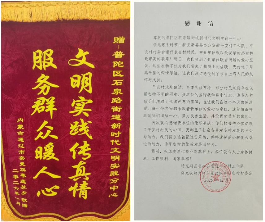 经过一个月的收集与整理,满载石泉温度爱心包裹,通过邮政快递陆续发往边疆。不久后,两份带着边疆泥土气息的感谢“飞”回了石泉——苇莲苏乡的锦旗上,金黄的字迹闪耀着质朴的情谊;平安村村委会的感谢信中写道:“捐赠犹如雪中送炭,为孩子们增添了抵御严寒的保障,也让我们在这个冬天倍感温暖。每一件衣物都承载着爱心与牵挂,这份情谊将激励我们团结一心,努力改善生活,建设更加美好的家园……”。