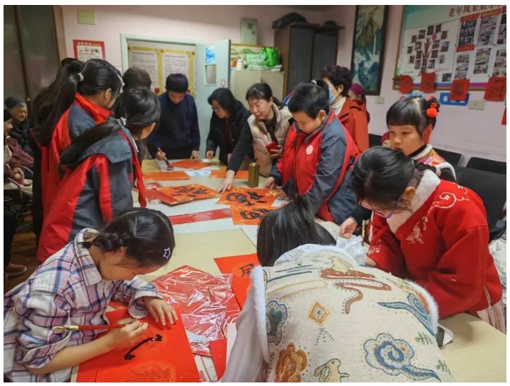 表演尾声,现场参与活动的同学们挥毫写下“福”字和对联,红底黑字的“福”字被一一送到老人手中。“这‘福’字比买的还珍贵!”奶奶爷爷们捧着福字笑得合不拢嘴,“孩子们有心了!”