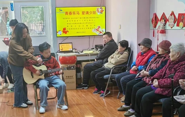 “你是遥遥的路 山野大雾里的灯……”演出在周同学清澈的《如愿》歌声中拉开序幕。当“愿你所愿的笑颜”唱到高潮时,一位老爷轻轻跟着打起了节拍。何同学的吉他弹唱《青涩的时光》则带着大家穿越回少年时代,轻快的旋律让老人们跟着打起了节拍,现场仿佛变成了一场温馨的“青春回忆杀”。
