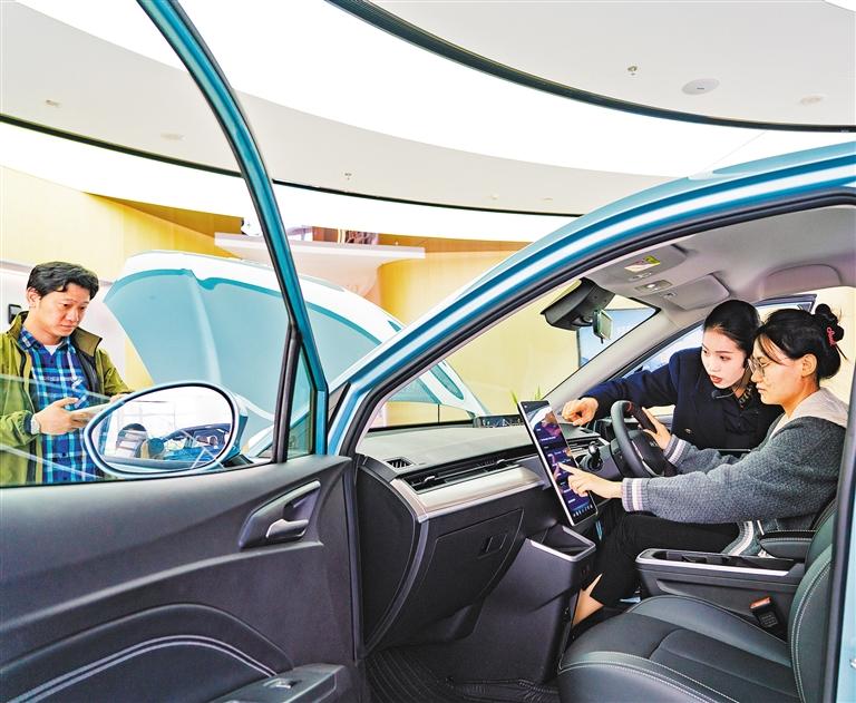 4月1日,位于上海市普陀区的哪吒汽车全球总部展示大厅,工作人员在介绍新款车型。哪吒汽车全球总部去年在上海普陀区启用。