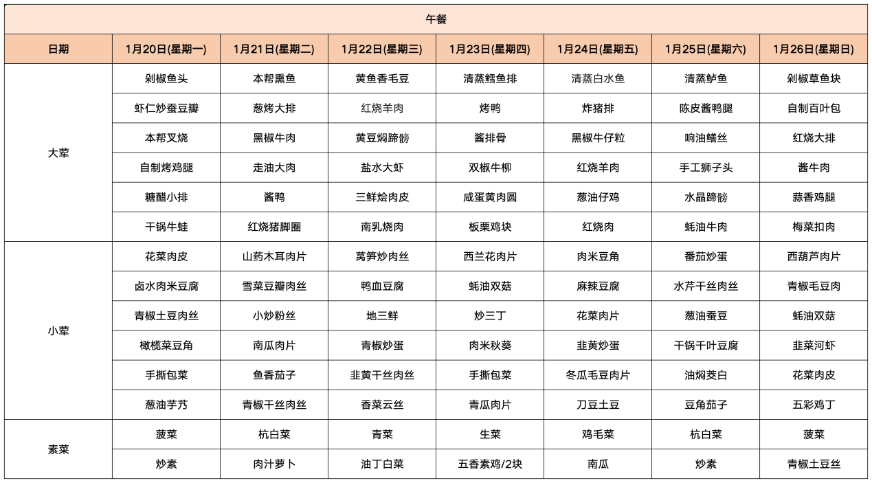 桃浦社区食堂一周菜谱抢先看(1.20-1.25)