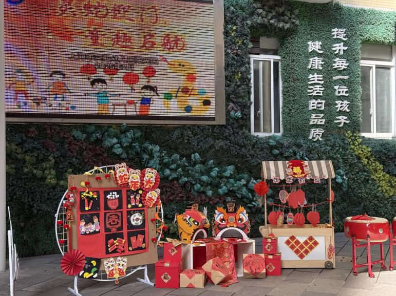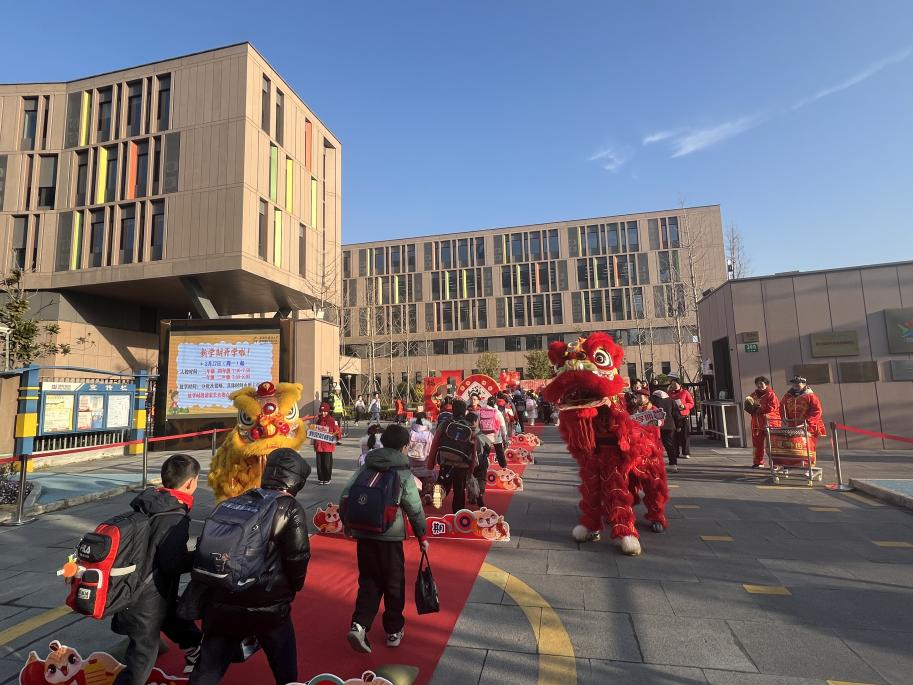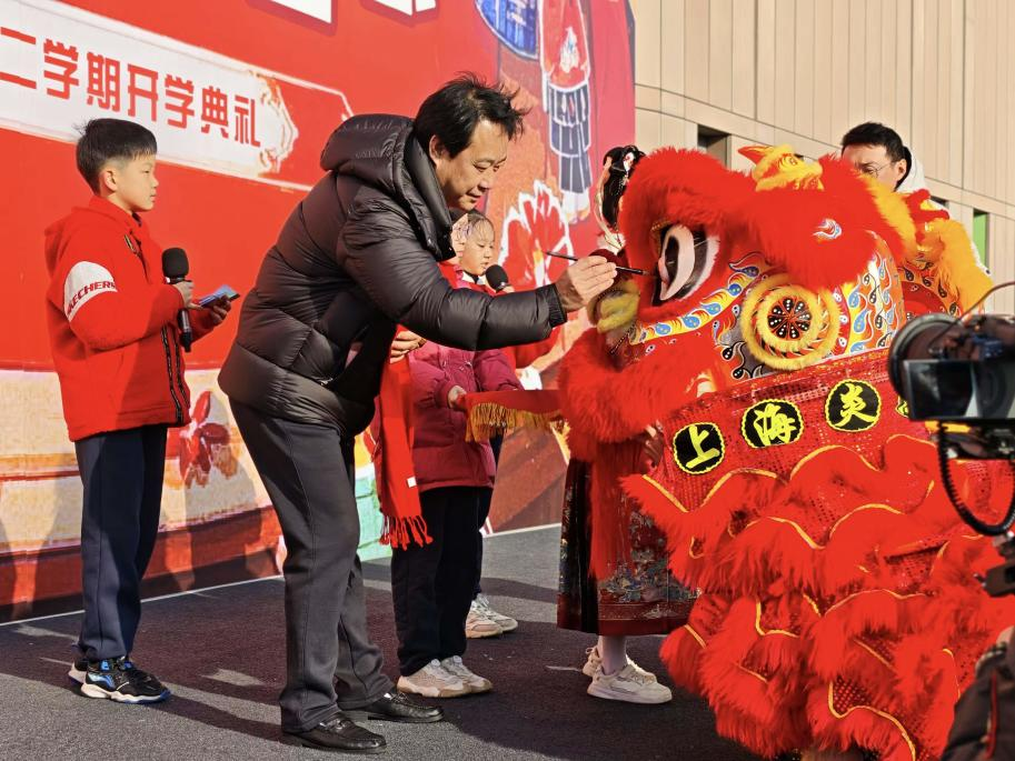 上海外国语大学附属普陀实验学校换上了“新装”,披上了“红妆”,处处洋溢着“首个非遗版春节”后的浓郁氛围。同学们跨过祝福跨栏、抽取福气盲盒,伴随着激昂的锣鼓声,两只威风凛凛的狮子欢腾跃出,共同欢庆春天与新学期的来临。