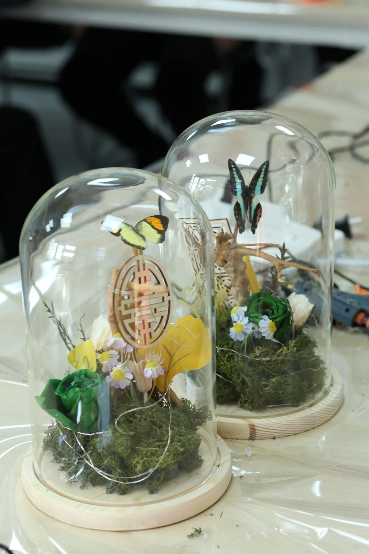 接着引入“精灵”,小心翼翼地将蝴蝶元素安置在植物之间,参与者依据蝴蝶的不同颜色进行巧妙搭配,模拟自然共生场景,让灵动的蝶影与绿植相互映衬。随后绕上小灯串,按下按键即可发光。罩上玻璃灯罩后,蝴蝶在玻璃罩中轻盈展翅,周围的植物与花朵彼此映衬,为这一方小小天地注入无限生机。蝴蝶与植物和谐共生,共同构建出一个自然、宁静且美好的微缩世界。