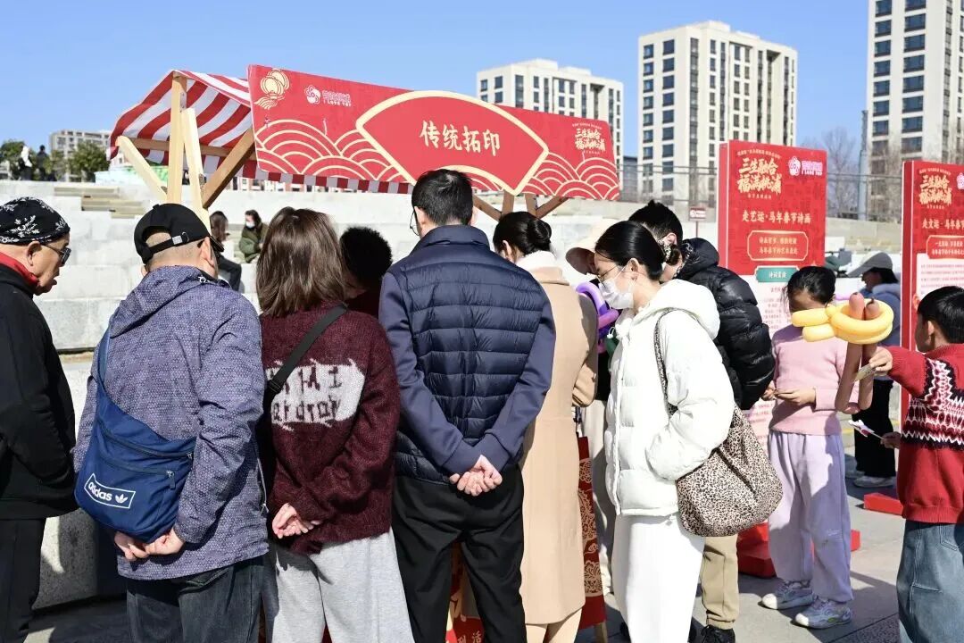 新春祈福活动区内墨香四溢。书法老师现场挥毫泼墨,一副副春联、一个个福字在笔尖流转之间,将新春的祝福送到居民手中。不少居民自带吉祥佳句,有的则在现场精心挑选心仪的联语,将“私人定制”的年味带回家。一旁的拓福字体验区也排起了长队,家长带着孩子一起动手,亲手拓印出生肖福字,在实践中感受传统技艺的魅力。“今年是我们家小朋友的本命年,拓印祈福,希望新的一年顺顺利利。”住在附近的霍逸一家对游园会倍感惊喜,积极参与其中。