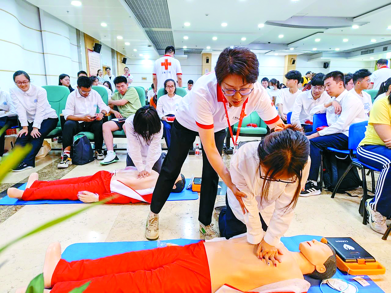 此次培训共8课时,分为线上4课时和线下4课时,围绕心肺复苏、创伤包扎等展开培训,旨在培养学生基本的应急救护能力。“急救培训很有意义,一方面可以掌握急救技能,让自己有帮助别人的能力,另一方面通过学习让我更加敬畏生命、热爱生命。”参训学生陆宸凯告诉记者。