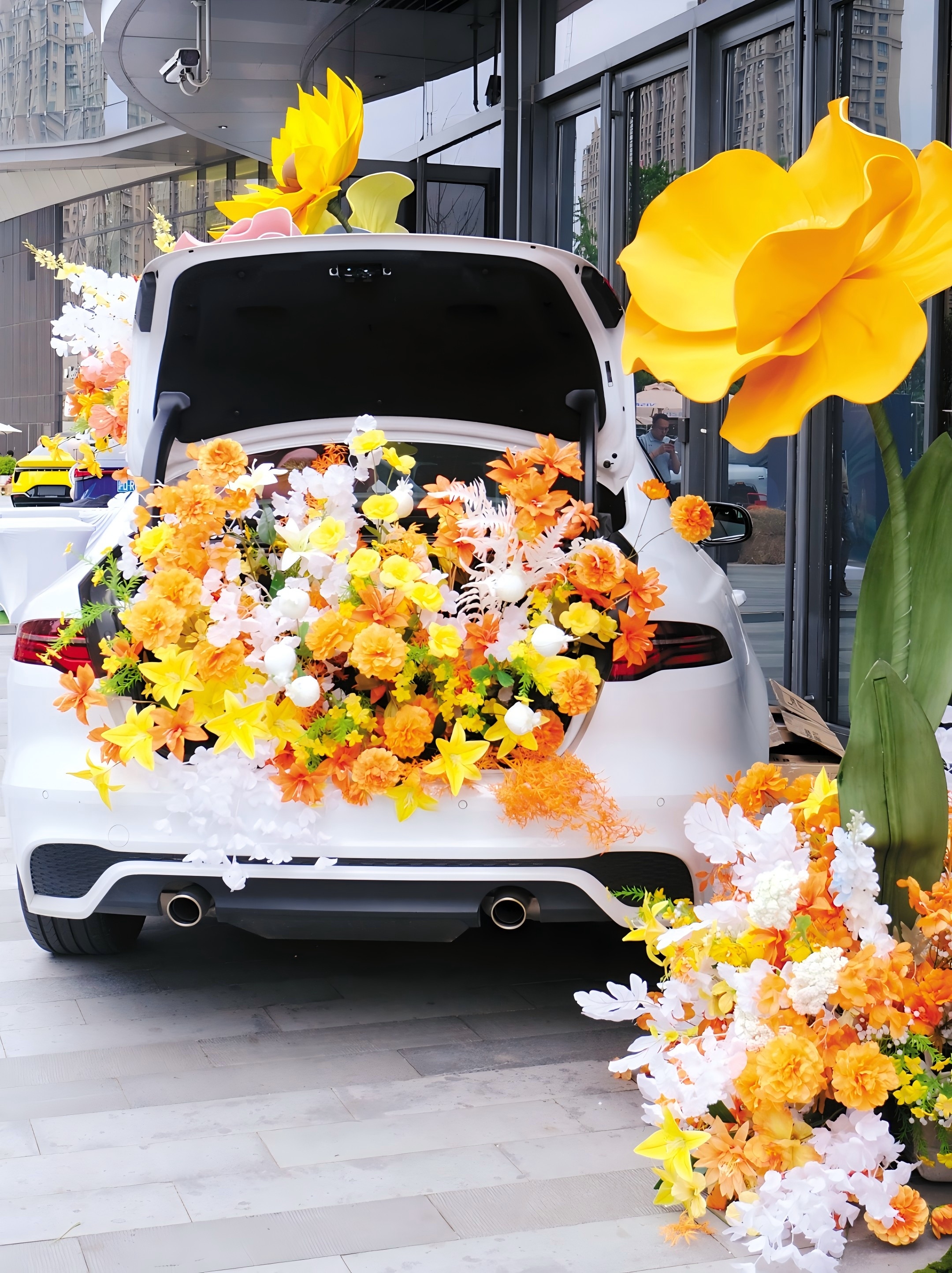 活动现场,一座高2.5米、宽3米的巨型花艺咖啡杯成为焦点。这件“半马苏河”文创孟菲斯咖啡杯的等比例放大装置,杯口倾泻出粉紫色的浪漫“花瀑”,吸引众多市民驻足打卡。与之呼应的是一辆以“流动的艺术展”为概念的创意展车,车辆后备箱中倾泻的缤纷花海与隐藏其中的文创产品,通过高饱和度色彩的碰撞,营造出一种极具冲击力的视觉效果,让每一位靠近的人都不禁眼前一亮。