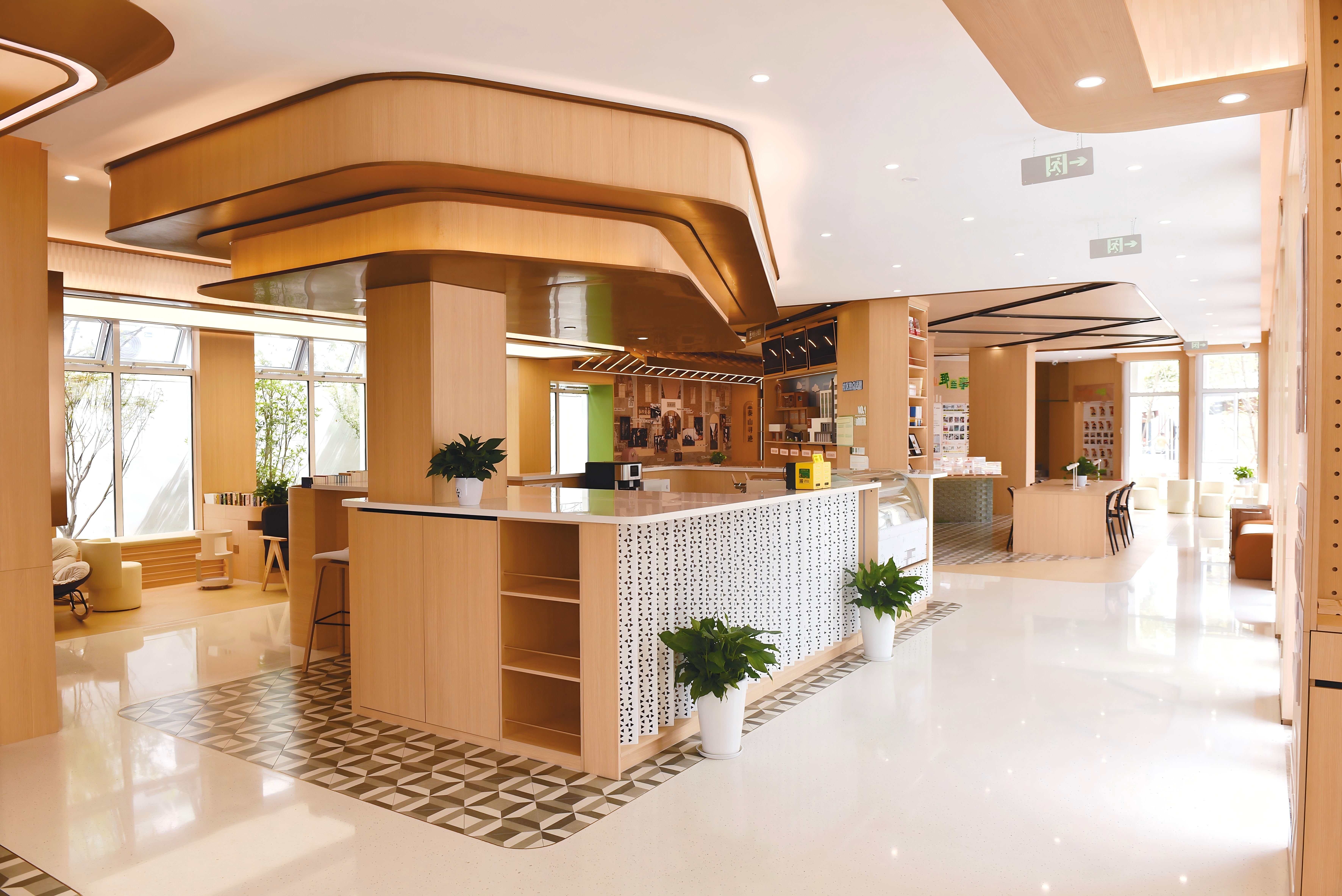 夕阳西下,蝉鸣盈耳。几位老人在“人”字形的柏油路上闲步,孩子们穿梭在疗愈花园内嬉戏。一旁的商铺里,孙北北面包店正迎来几位排队选购次日早餐的白领……