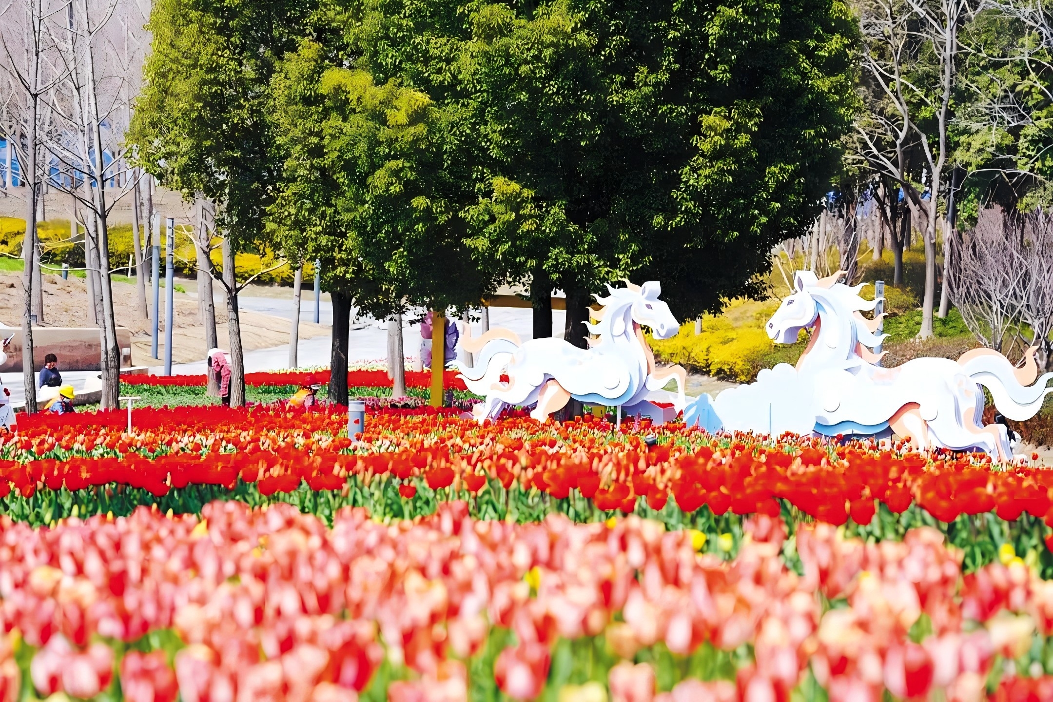 公园里超大型立体郁金香花海正值盛花期