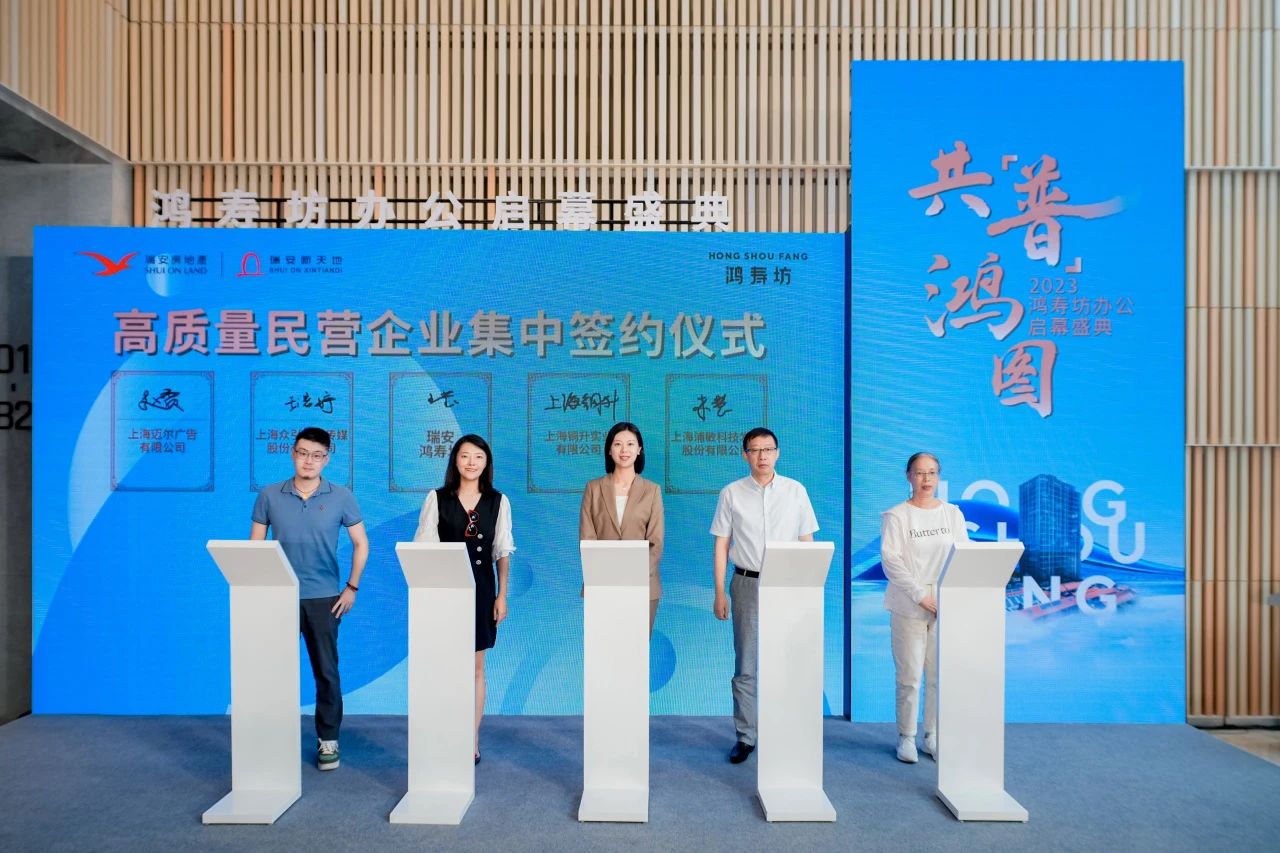 目前鸿寿坊已吸引来自科技、贸易、传媒等不同行业的头部企业。活动当天,瑞安新天地鸿寿坊项目方代表与已入驻的四家代表企业进行集中签约。