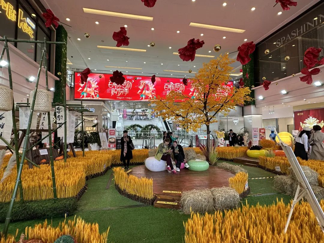 步入内厅,一片金色的麦田映入眼帘,银杏、草垛、竹架与挂幔交织在一起,层叠错落的麦浪在金色辉光的映照下流转,为初冬的城市增添了一抹自然的绚丽色彩,也让整个空间充满了温暖和希望,打造出独特的商场空间氛围感。