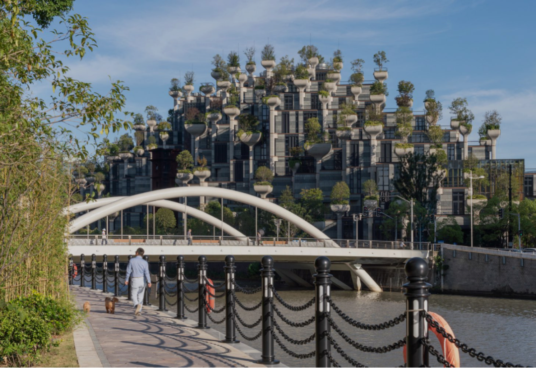 沿莫干山路而行,首先映入眼帘的便是天安千树。这座2021年底开业的购物中心,由英国设计师Thomas Heatherwick操刀,外立面嵌入数百个露台、种植超千棵植被,形成“悬浮森林”景观。