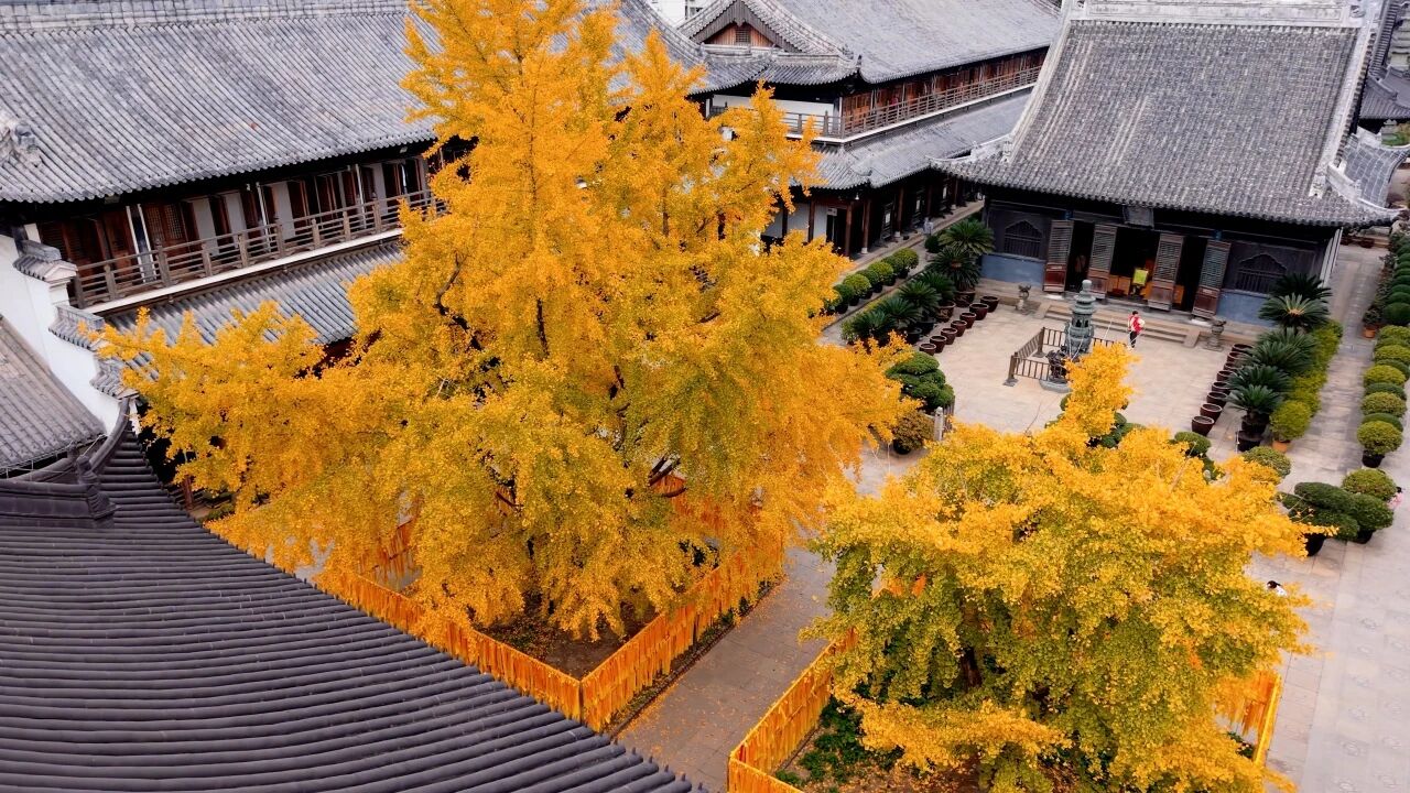 深秋时节,满树金黄与古朴大殿相映成趣,微风拂过叶片簌簌作响,殿后群鸽时而停驻枝头、时而低空盘旋,为古寺增添灵动气息。