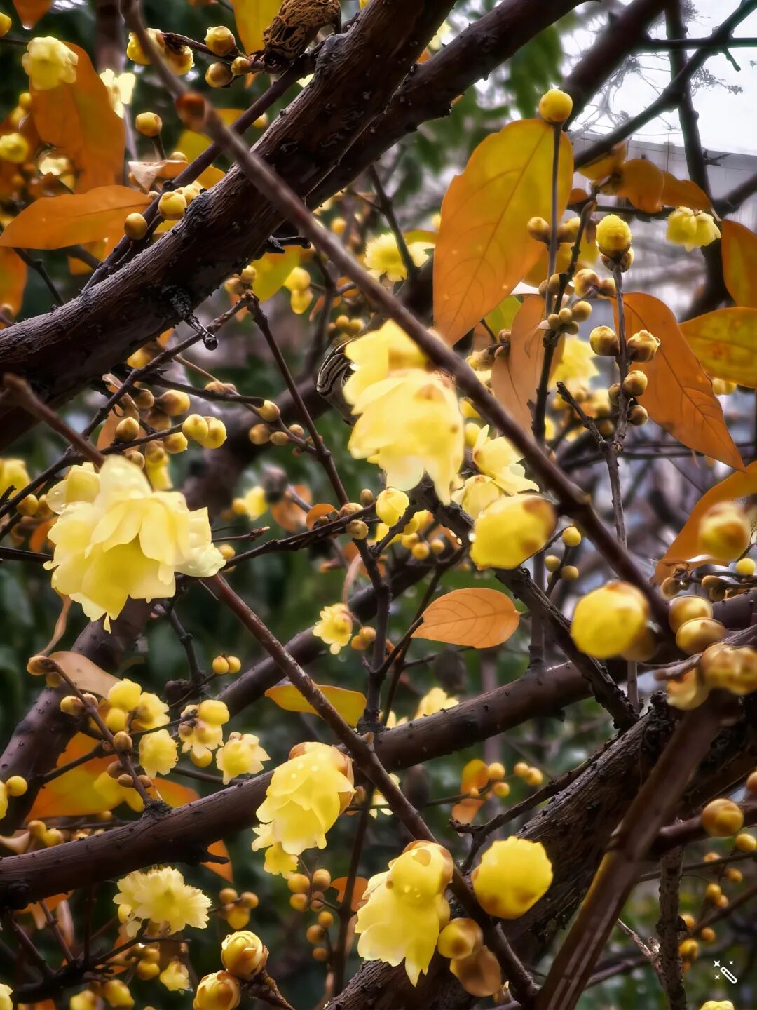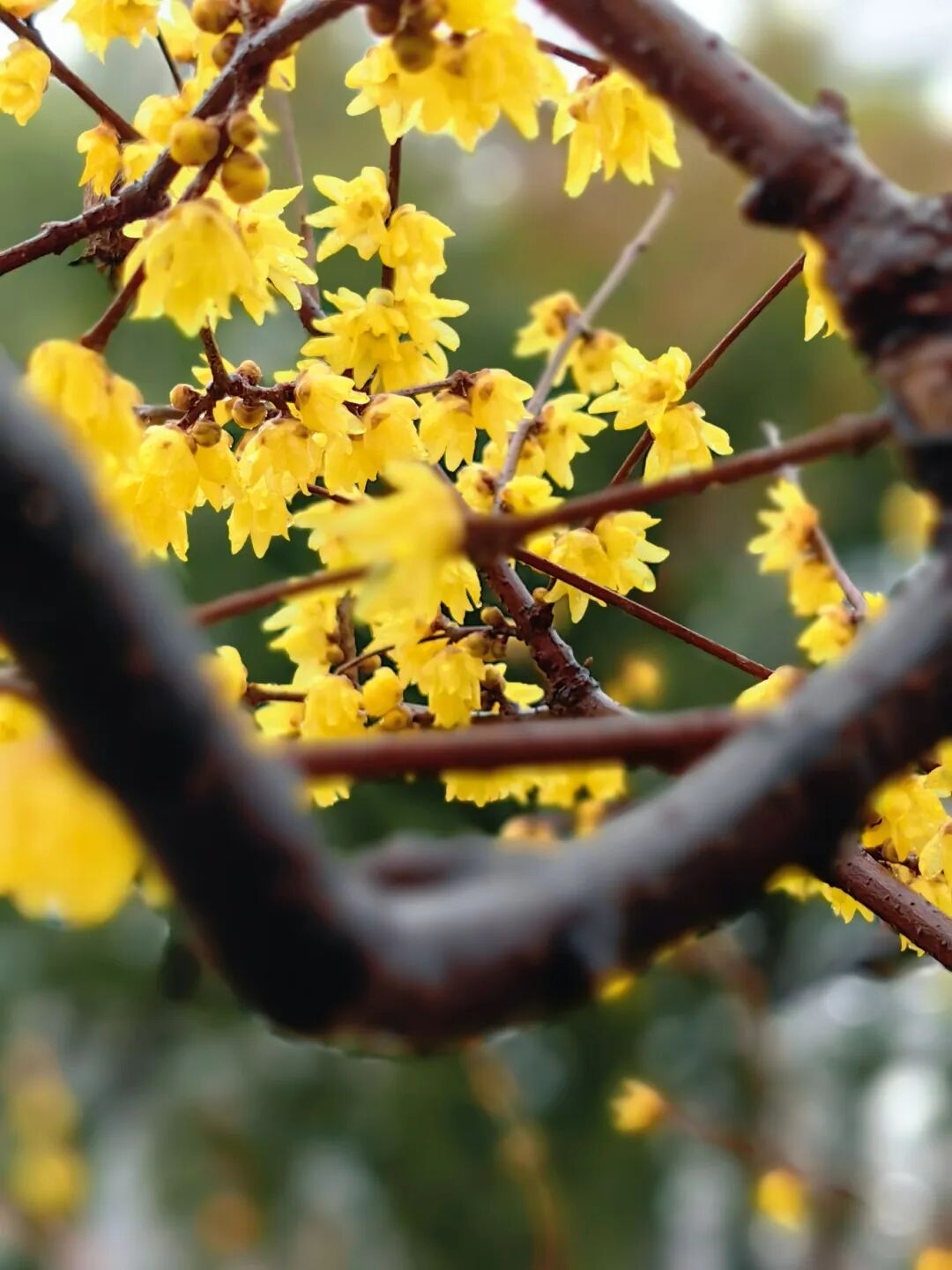 晴日里的蜡梅,金黄花瓣在阳光下熠熠生辉,清冽的冷香疏朗通透,隔着几步远都能闻到;而雨天的蜡梅更有韵味,金黄花瓣沾着雨珠,风一吹梅露轻坠,冷香混着湿润的空气钻进鼻腔,褪去冬日沉闷,只剩沁人清爽。此刻方懂,晴日有晴日的明媚,雨天有雨天的雅致,皆是赏梅的美好。