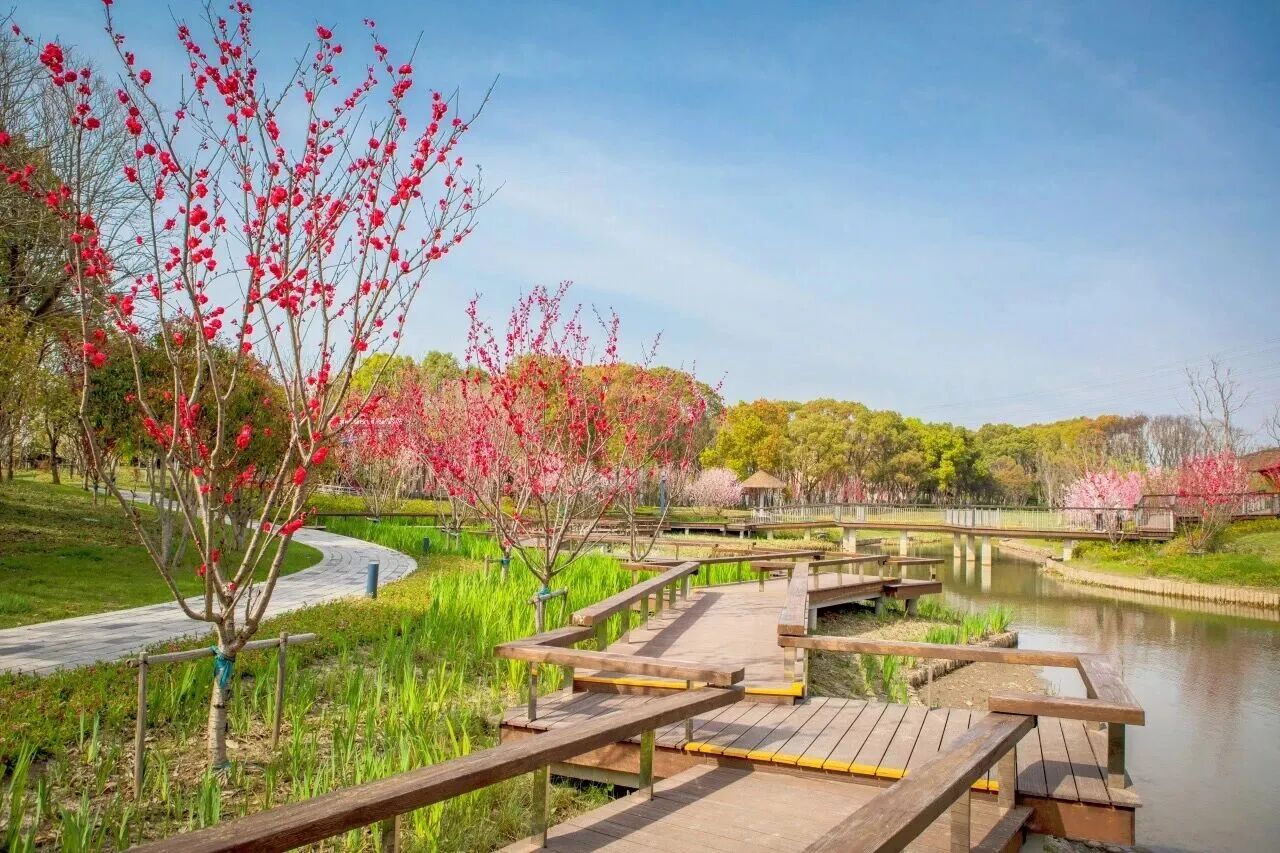 主出入口设于普陀区古浪路近敦煌路一带,从此入园可便捷抵达A、B两大官方划定的宠物友好区。这座占地100公顷的绿地,被誉为上海西北部的“疗愈之肺”,以广袤绿意与匠心设计,成为都市中难得的自然秘境。开阔的疏林草地被暖调霞光浸润,蜿蜒水系穿梭其间,景致兼具磅礴气度与静谧之美,尽显自然本真韵味。公园设计取“行云流水”之意,以中国传统书法与舞蹈为灵感,蜿蜒步道巧妙串联起各类空间,登高俯瞰,流畅线条交织成一幅灵动的大地艺术作品,让自然与艺术在此和谐共生,毛孩子可在此玩耍。绿地免费对外开放,十分适合全家携宠露营、徒步赏景。