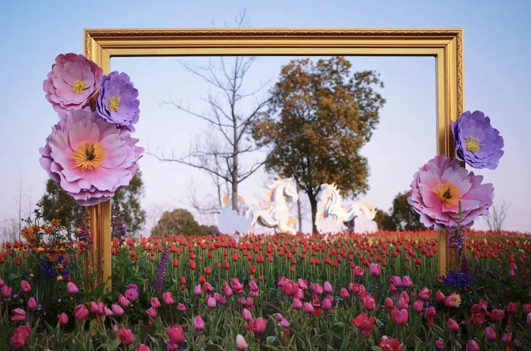 花海内共精选了18个郁金香品种,涵盖了从淡雅单色到繁重复色的多种色调。红色系的法国之光、世界火等,橙色系的世界真爱、阿德瑞母,白色系则选取兰卡、斯普利突破、纯金,紫色系为紫衣王子,桃红色系有范伊克、拉里贝拉,粉色系包括巨人粉、荷兰设计和粉色热情,此外还有门童、普利泽、肉色范伊克等晕染色系品种。这些品种高低错落、错落有致,在微风中摇曳生姿,为春日景观增添了丰富的层次感。
