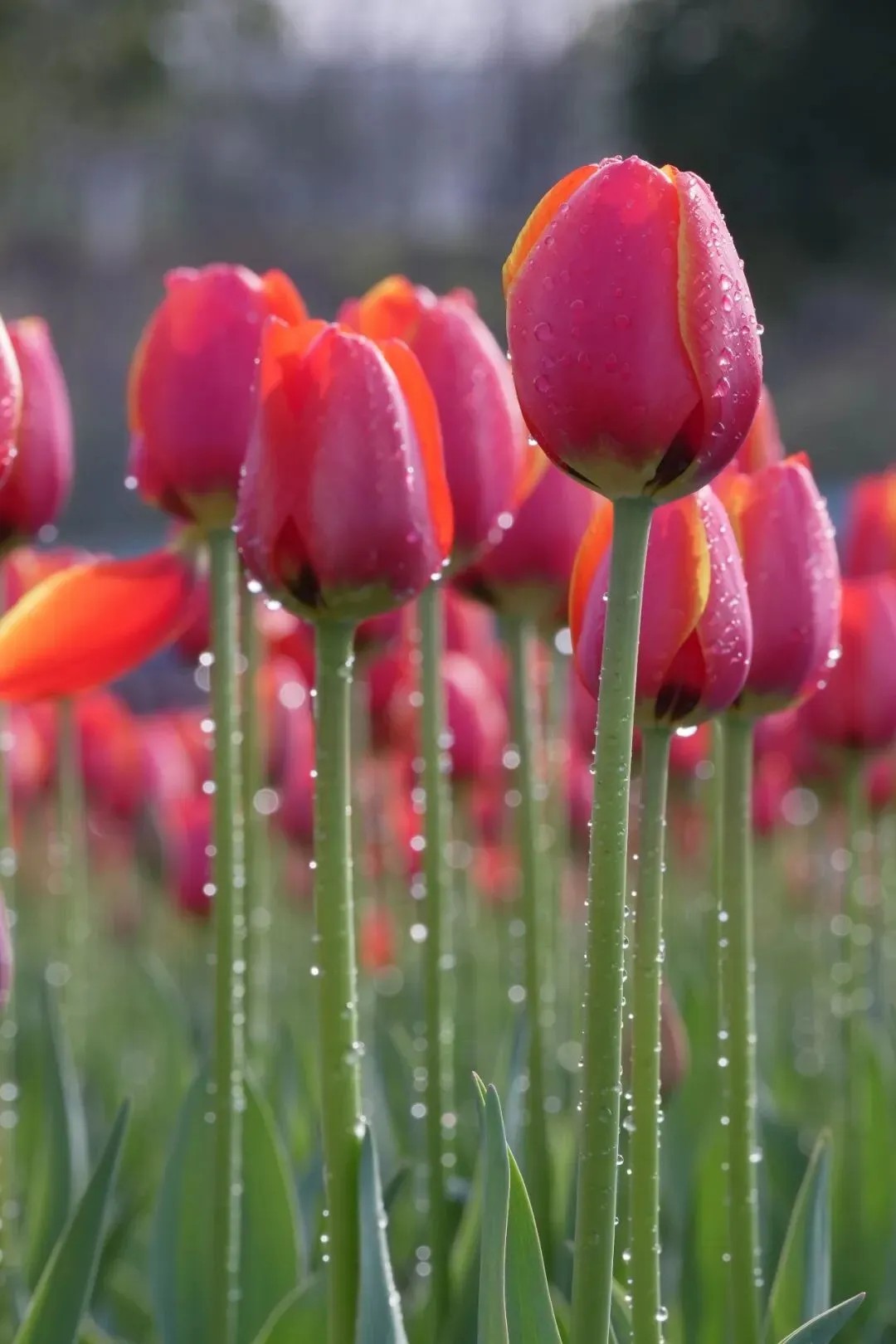 这片占地近两个标准足球场大小的郁金香花田,依托公园起伏的地形,顺着坡势层层铺展。从高处俯瞰,粉的、红的、橙的、紫的,各色郁金香被巧妙组合,宛如一条条流动的色带,沿着地形的“笔触”蜿蜒前行。所有花朵都盛放的时候,整个花海便成为一幅活色生香的水彩画。