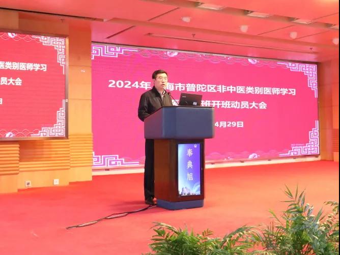 会上,奉典旭主任作开班动员并致辞。他指出,普陀区在推动中西医融合发展,加强基层中西医结合人才队伍建设有着良好的基础。区中心医院、区人民医院、区利群医院先后被评为全国综合医院中医药工作示范单位,区中心医院是上海中医药大学首家区级附属综合性医院,以多学科中西医交叉渗透为特色,医院多名骨干入选上海市中医药高层次人才引领计划,为全区医务工作者起到示范引领作用,并就继续推进普陀中西医融合发展,聚力创建全国基层中医药工作示范区提出三点要求:一是提高站位,高度重视。要发挥好区中心医院、区中医医院的的引领示范担当作用,培养和造就一支高水平中西医结合人才队伍,促进中西医相互补充、协调发展,协同推进公立医院高质量发展试点工作。二是汇聚创新,提质增效。引导支持多学科参与中医药创新发展,带动基层中医药技术方法和适宜技术的推广应用,凸显中西医结合临床价值,推动基层中西医服务内涵提升。三是博采众长,厚积薄发。参培学员要珍惜学习机会,认真听讲、勤于实践。不断提高自己的医疗水平和综合素质,将所学所得运用到实际工作中,为人民群众提供更加优质、高效的医疗服务。
