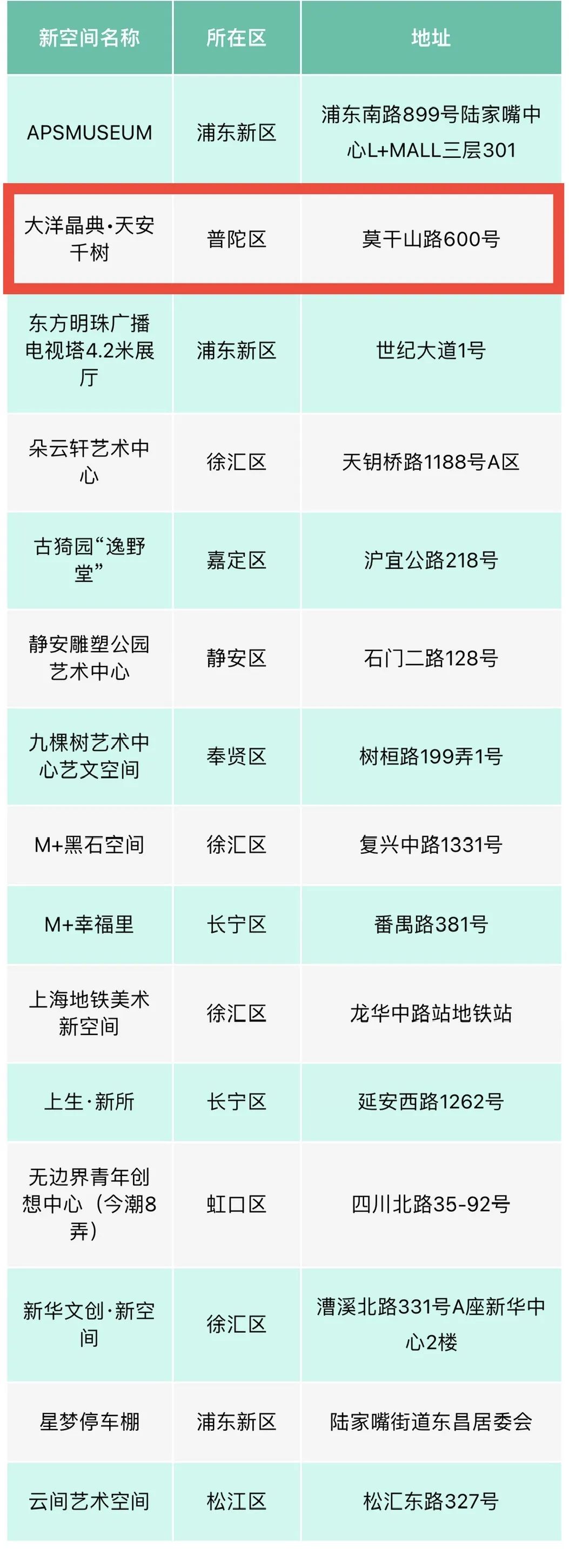 在上海市文化和旅游局的指导下,上海市美术馆协会组织开展了“美术新空间”的认定工作。经主体报名、各区审核、专家评审等程序,首批15个“美术新空间”于日前正式公布。普陀区的大洋晶典?天安千树榜上有名! 首批“美术新空间”名单 (按拼音字母排序) 近年来,为满足市民文化需求,许多艺术机构和社会主体开始走出美术馆、画廊等专业艺术场馆,在商场、商务楼宇举办美术展览展示活动,逐渐形成了一批“美术新空间”。 区别于传统的美术馆、博物馆、展览馆、画廊等展示空间,“美术新空间”指在室内或户外的特定空间内,经常性向社会公开陈列展示视觉艺术作品的非营利性场所,包括但不限于商业综合体内、办公楼宇内、产业园区内、已改造的老厂房内、众创空间内、机场候机楼内、旅游景区内、游船内、邮轮内的展览空间。 美术馆和美术新空间的繁荣发展也得益于相关领域立法的同步跟进和实施,今年4月15日起正式施行的《上海市美术馆管理办法》是全国首部美术馆领域省级政府规章,助推申城的美术馆从“规模时代”步入“规范时代”,从高速发展进阶到高质量发展,为上海众多美术馆发展标出明晰“健康步道”。《管理办法》对美术馆的延伸服务都提出了更高的要求,比如鼓励和支持美术馆与有条件的单位共建共享,利用工业遗存、创意园区、交通枢纽、商业综合体等公共空间举办美术展览和活动,拓展和延伸文化服务。可以说,“美术新空间”的挂牌,正式回应《管理办法》的要求,将进一步引领申城美术事业迈上新台阶。 普陀区“美术新空间”介绍及展览信息 大洋晶典·天安千树 定格城市“新生”,赋予沿岸建筑以新生。 它的建筑设计出自当年上海世博会英国馆设计者、英国“鬼才”设计师 Thomas Heatherwick 之手。占地超过300,000平方米的“大洋晶典·天安千树”位于上海面粉厂旧址,是上海市优秀历史建筑。以别致的艺术魅力,打造全新潮玩地,为上海市民提供与众不同的滨河艺术新空间。 数字时尚狂想 展期:即日起-6月30 日 地址:普陀区莫干山路600号 简介:本次展览呈现的作品源自于国内领先的EST时尚数字社区,来自国内外的时装设计师和潮流科技艺术家,以她们独特的艺术视角和高科技技术,创作出一系列令人惊叹的虚拟时尚作品。
