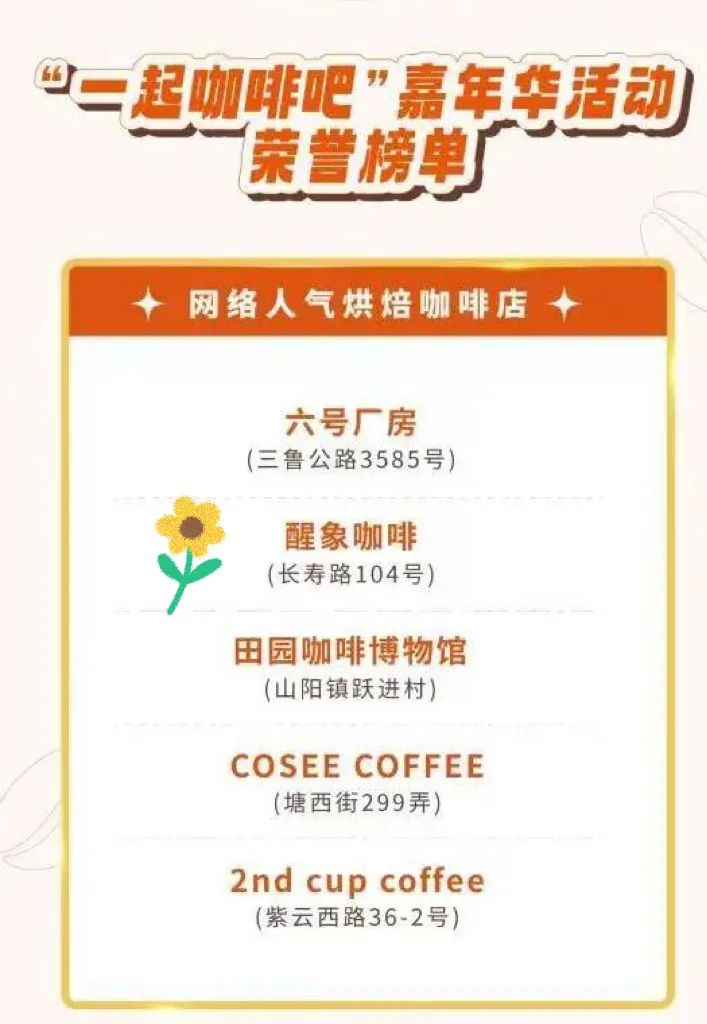 5月20日,第三届上海咖啡文化周开幕式在上海徐汇滨江举行,今年的上海咖啡文化周将持续半个月,活动期间将举行首届西岸国际咖啡生活节、全城免费喝、“咖啡+剧目”“咖啡+运动”等丰富多彩的活动。 活动当天,上海市数十家精品咖啡店代表齐聚中央广播电视总台上海总站国际传媒港园区,共同见证“一起咖啡吧”嘉年华活动荣誉榜单的发布。经过上海16个区首轮推荐,以及一个多月网络投票,上海18家特色精品咖啡店分别获得“网络人气烘焙咖啡店”“网络人气特调咖啡店”“网络人气氛围咖啡店”“网络人气甜品特色咖啡店”等四大赛道荣誉,12家咖啡店获得“元气活力咖啡店”特别荣誉。 其中,普陀有2家咖啡店入选“一起咖啡吧”嘉年华活动荣誉榜单。醒象咖啡店入选网络人气氛围咖啡店荣誉榜单;tuan bakery+café入选人气活力咖啡店荣誉榜单。来跟小编一起认识下他们吧! ELEFANCO醒象咖啡 醒象品牌成立于2019年,店家怀着对咖啡的热情,从一家拐角咖啡小店,到目前的纯手工糕点,咖啡,面包烘焙。 店内也有给听障咖啡师就业的岗位,从无声到有声给进店的客人,可以提供短暂邂逅的闲暇与宁静。在这个繁忙的都市中感受到生活本味,回归纯粹! 店内无论是咖啡还是点心,每一份都融入了无声咖啡师的热爱与心意。 地点:普陀区长寿路104号 Tuan bakery+café 店内装修清新自然,气氛宁静优雅。那抹标志性的绿色,引来无数时髦人士竞相打卡。 多元化的咖啡产品和不定期上新的季节性饮品,搭配店内人气十足的纯手工面包蛋糕,组合成多款优惠超值的下午茶套餐,一品一坐一聊就是一下午,享受惬意悠闲的美好时光。 普陀区还有多家精品咖啡店,分布在热门商圈、绿地公园、街头巷尾,都各有特色,各具情怀,小编将陆续为大家推荐,让每个人都能找到自己精致、松弛抑或是新潮的生活方式! 地点:岚皋路583弄28号品尊商业街
