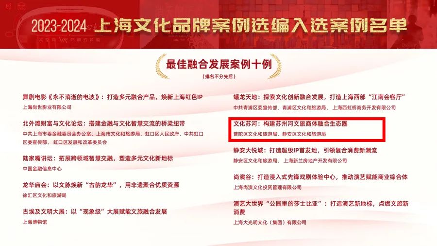 3月14日,2023-2024上海文化品牌案例选编成果发布会在中国金融信息中心举办。其间集中发布了最具影响力、最佳创新发展、最受市民欢迎、最佳融合发展、最佳海外传播等5类50个上海文化品牌最佳案例。普陀区文旅局报送的“文化苏河:构建苏州河文旅商体融合生态圈”荣获最佳融合发展案例。 苏州河是上海的母亲河。近年来,区文旅局认真学习践行习近平文化思想,深入贯彻落实习近平总书记关于“人民城市人民建,人民城市为人民”“以文塑旅、以旅彰文”“推动中华优秀传统文化创造性转化和创新性发展”系列重要指示精神,紧紧围绕区委区政府整体工作部署,充分发挥区位优势,以新时代新机制推动“半马苏河”文旅品牌建设。主动推进国内外文化会展、文艺活动、体育赛事、创意园区、旅游休闲、都市消费等元素沿苏河水岸大范围大规模集聚汇融,着力打造上海节展赛会“顶流城市”重要承载地、向国际社会展示上海“人民城市”建设成效的新窗口,比肩有世界影响力的国际大都市城市中心河畔文化建设新地标,以及文旅商体展深度融合提振城市消费的新典范。 “文化苏河:构建苏州河文旅商体融合生态圈”这一案例正是上海文旅商体展联动发展的生动实践,展现了普陀区深化文化融合发展、发挥文化赋能作用的积极效应。 下一步,区文旅局将以本次评选活动为契机,进一步深入挖掘苏州河文化底蕴和旅游特色,积极整合文旅商体展等丰富资源,继续凸显水岸特色,策划推出更加优质、富有创意的文旅产品,持续打响“半马苏河”文旅品牌,助力上海“一江一河”文旅大品牌建设。