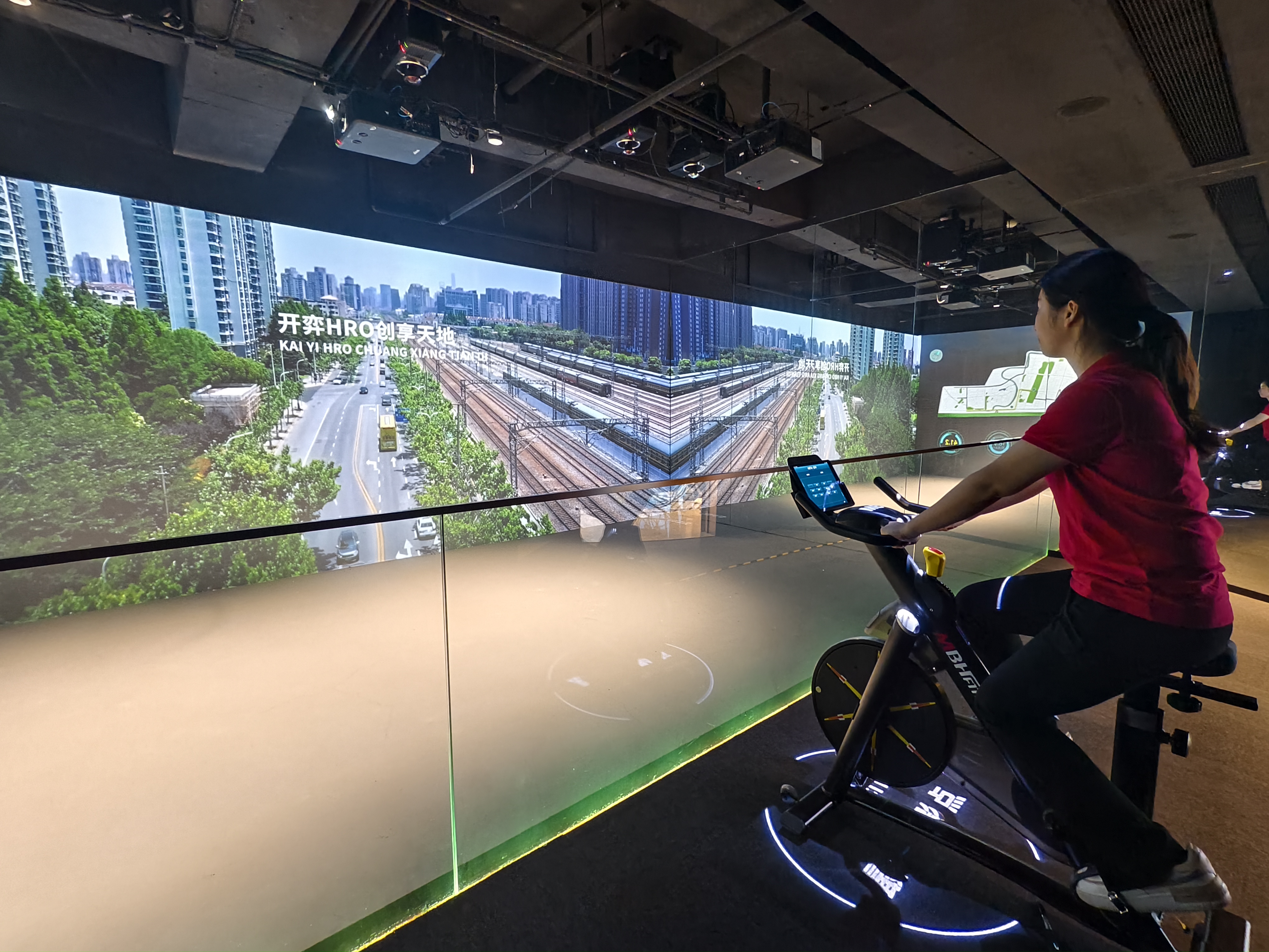 作为普陀区慢行交通示范片区及无架空线示范区,万里街道践行空间融合和绿色发展理念,在西站综合体党群服务站内设置万里街区实景体验空间,通过骑行设备打卡慢行体验线路,万里社区美丽的街景,身临其境的感受万里社区各项事业发展,城市更新脉络。