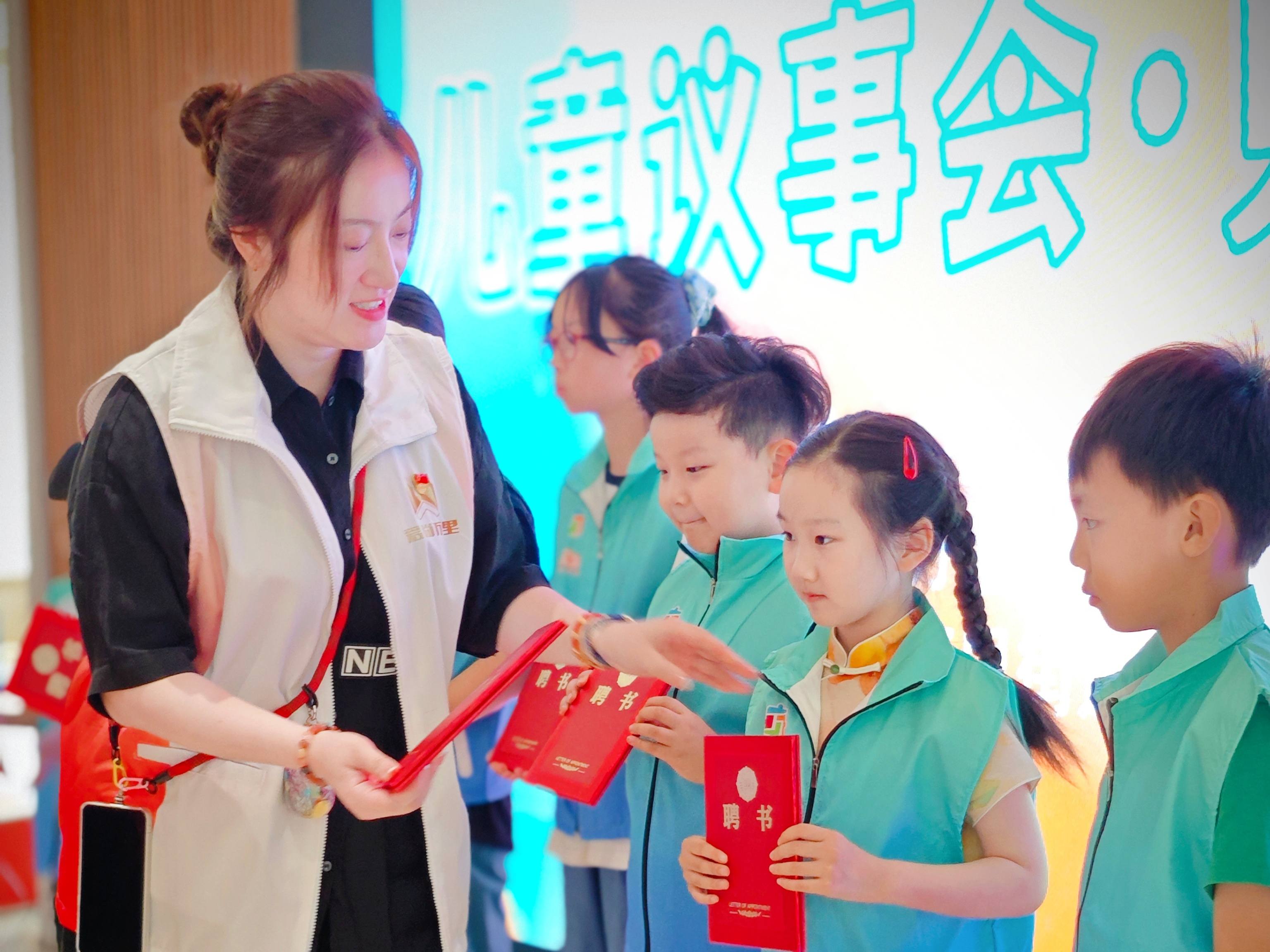 随着音乐响起,当选的儿童议事会成员们迎来了属于他们的荣耀时刻。中环家园党总支书记张佳玲为小朋友们颁发了聘书和志愿者服装,这不仅是对他们积极参与社区活动的鼓励,也是对他们肩负未来责任的肯定,更是对共享社区治理成果的期许。小朋友们接过聘书,眼中闪烁着坚定与自信,他们知道,这份荣誉意味着更多的责任与挑战。