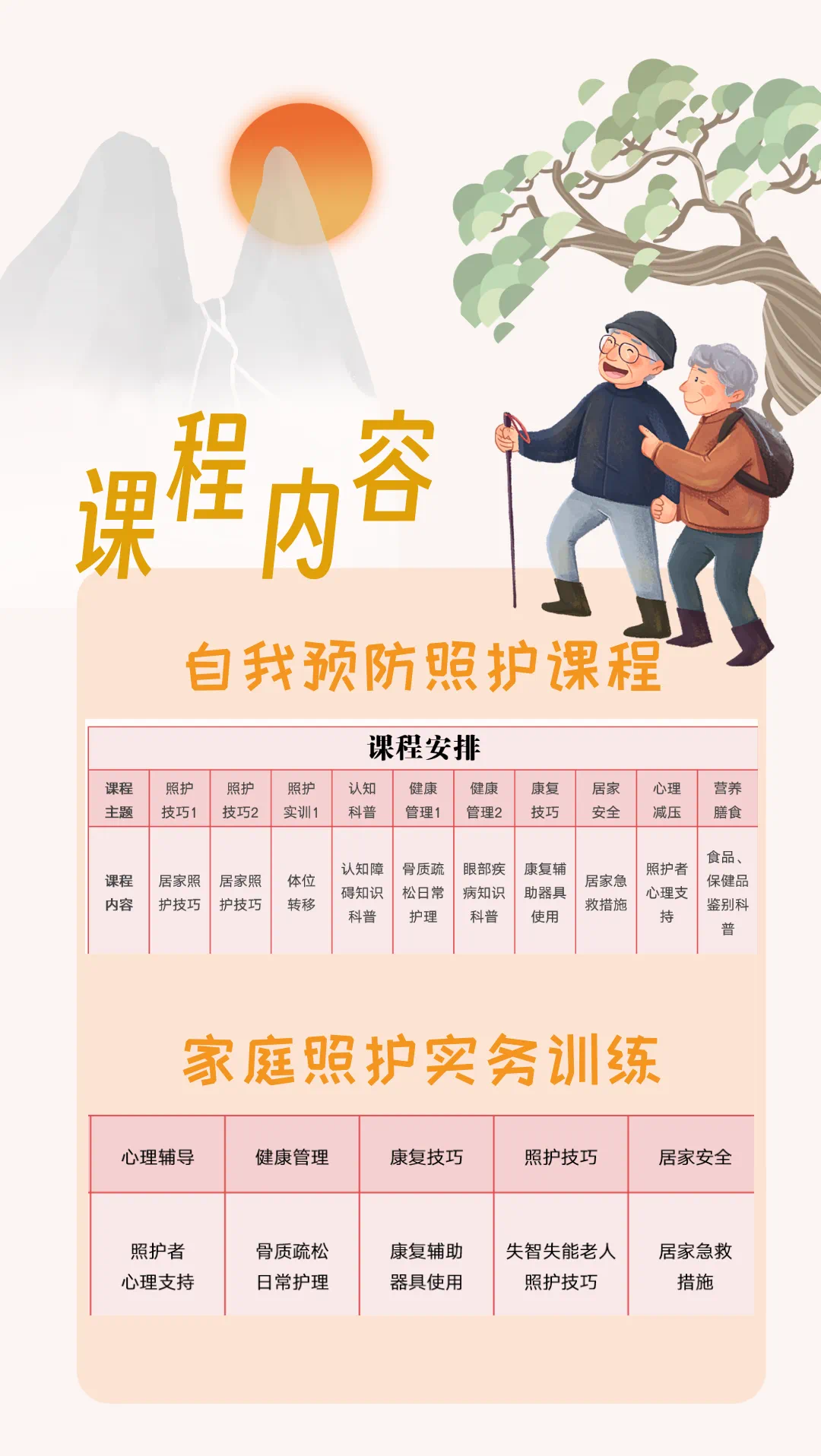 围绕健康养护和心理疏导,开展疾病防控、辅具使用、安全知识、健康管理等理论与操作培训。帮助照护者不仅能照顾好老人,还能提升自我预防意识和能力,更好地应对各种健康问题。