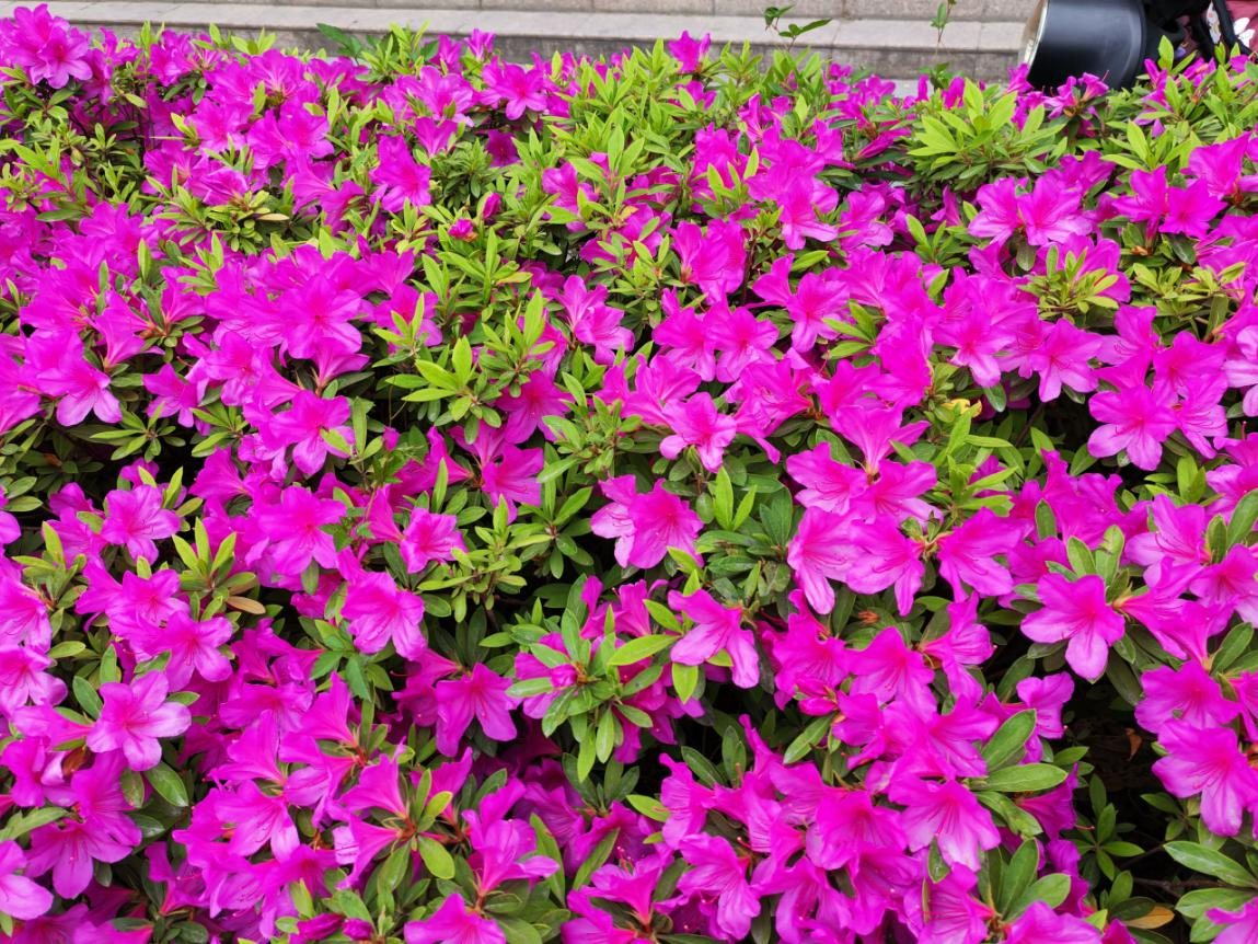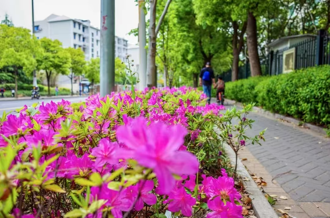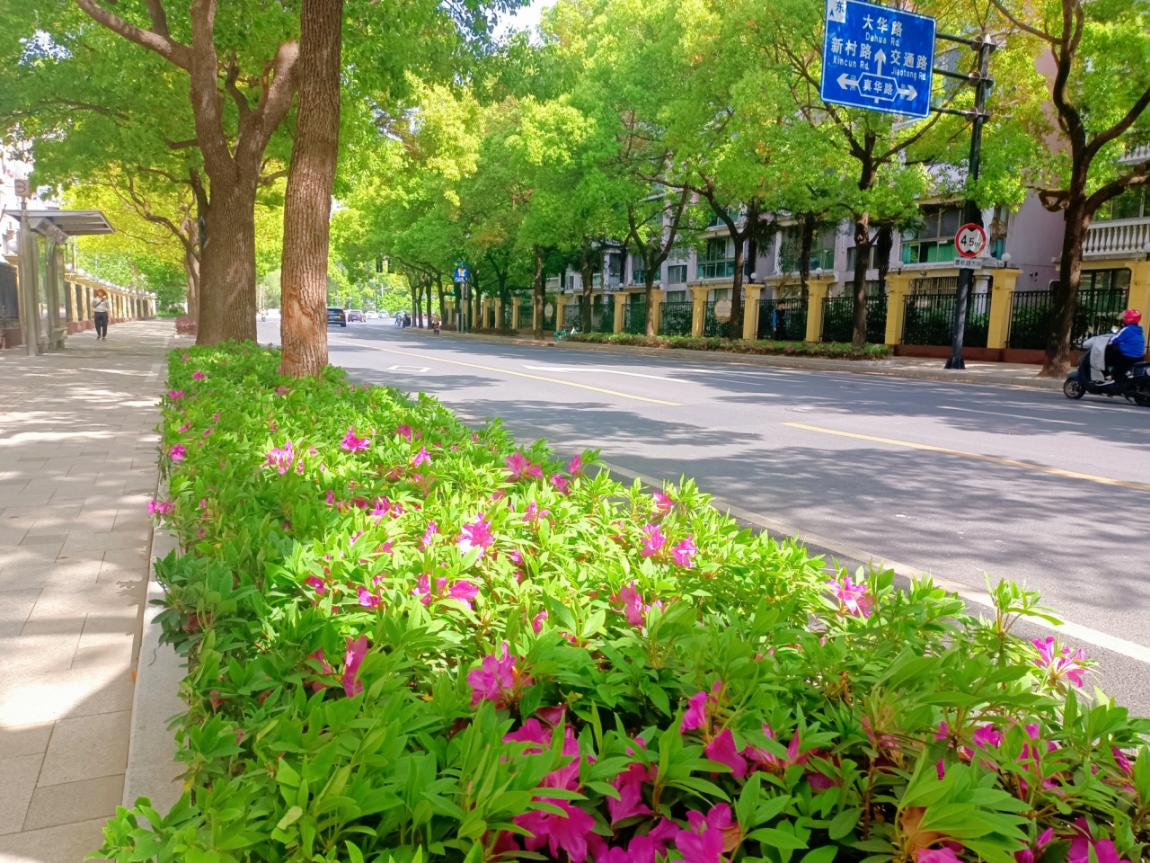 富平路、新村路沿线、万里公园、万泉绿地中杜鹃枝丫错落,默默地舒展着花瓣,用尽全力绽放自己的美丽,给来往居民带来一片姹紫嫣红的花海。