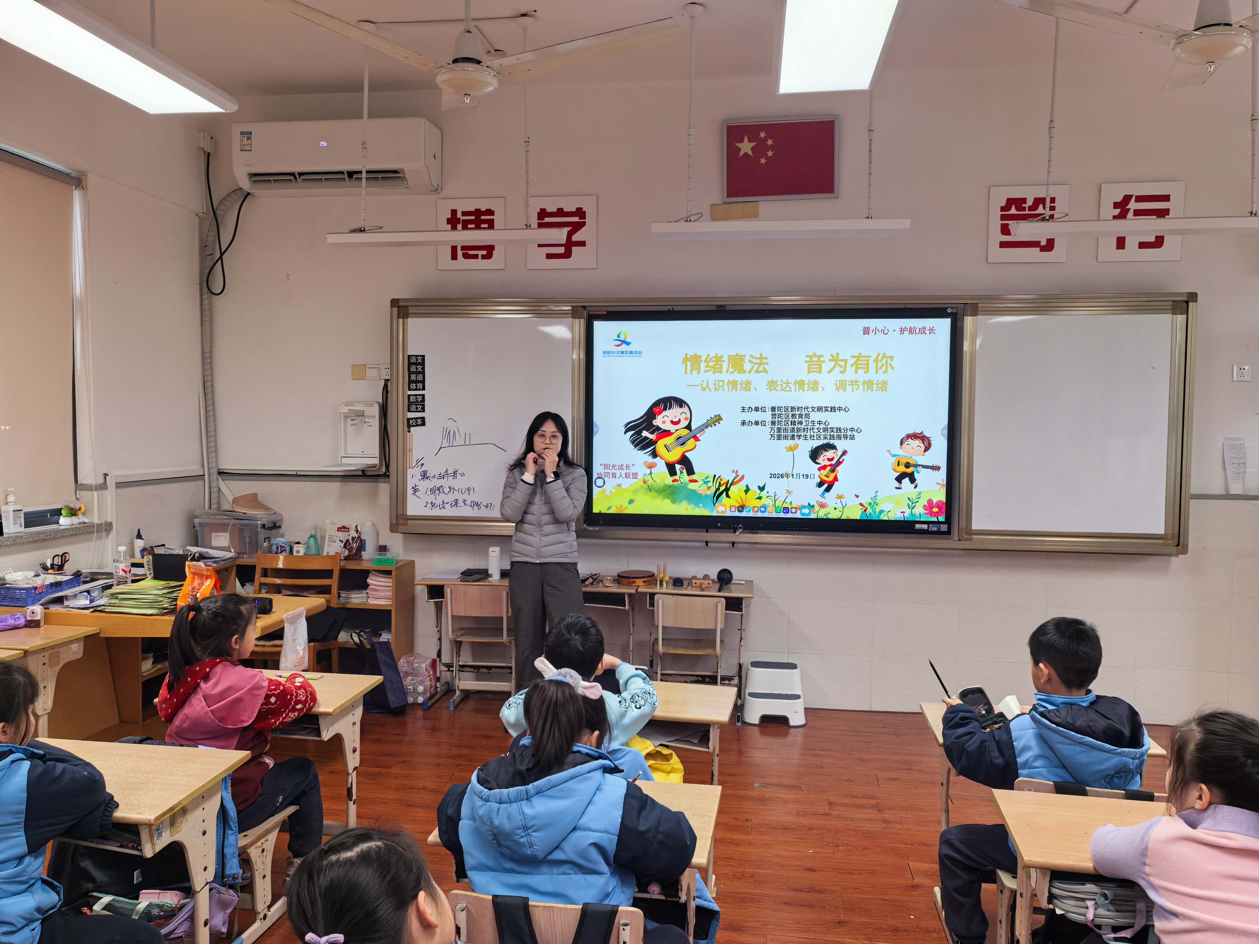 2026年01月22日 来源: 万里街道当节奏敲响心灵的节拍,当旋律串联情绪的脉络,一场专为孩子们准备的“情绪魔法”正在悄然上演!为守护青少年心理健康,创新心理健康教育形式,1月19日,在普陀区“阳光成长”协同育人联盟平台的支持赋能下,由普陀区新时代文明实践中心、普陀区教育局主办,普陀区精神卫生中心、万里街道新时代文明实践分中心、万里街道学生社区实践指导站承办,晋元附校协办的“情绪魔法,‘音’为有你”暨普陀区“普小心·护航成长计划”亲子音乐心理团体辅导活动顺利举行。活动将专业心理理念与趣味音乐疗愈深度融合,为晋元附校的学生们打造了一场浸润心灵、赋能成长的沉浸式体验。