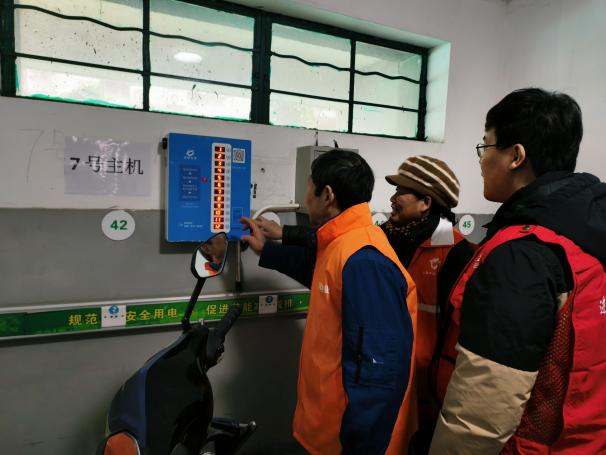 党员志愿者与居民区、物业工作人员一同检查车库用电安全