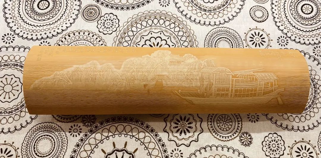 建党百年之际,一段段值得纪念的红色记忆也被作者刻画在竹子上。“烟雨楼台革命萌生此间曾著星星火,风云世界逢春誓起到处皆闻殷殷雷。”居民张阿姨轻轻念出竹板左上角刻着字,“这是董必武题嘉兴南湖烟雨楼的诗句。”“右边也有,右上角刻着‘南湖,建党一百周年纪念’。”居民吕阿姨指着作品说,“红船,这个船是象征革命起航的南湖红船,刻画得真好,窗户围栏和船桨都栩栩如生。”居民们驻足围观,细细讨论着。