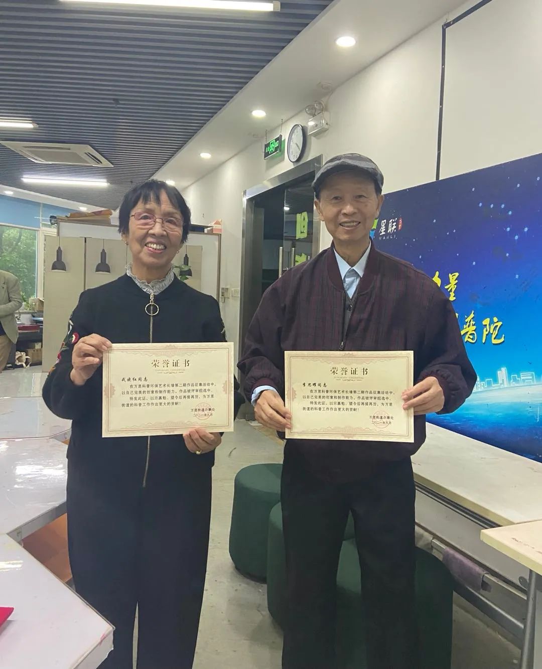 在邻里朋友的鼓励与支持下,两人以“一技之长”不断参与到各类社会公益活动中。加入学校环保手工课堂助力“双减”、担任社区防老年认知症系列手工讲师,夫妻两人将自得其乐的小兴趣发展成了“环保公益课堂”,创作的空间也从家中一隅走向更广阔的舞台。从一开始的废弃泡沫塑料作品到后期废弃纸浆雕塑、瓦楞纸拼画等各式环保作品,从一开始的“尝鲜”到后面的“无法自拔”,从一个人到一群人,从自娱自乐到回馈社会,在三十多年的环保手工实践里,他们真正实现了老有所乐、老有所学、老有所为,也在“独乐乐不如众乐乐”中不断书写着自己的老年精彩。