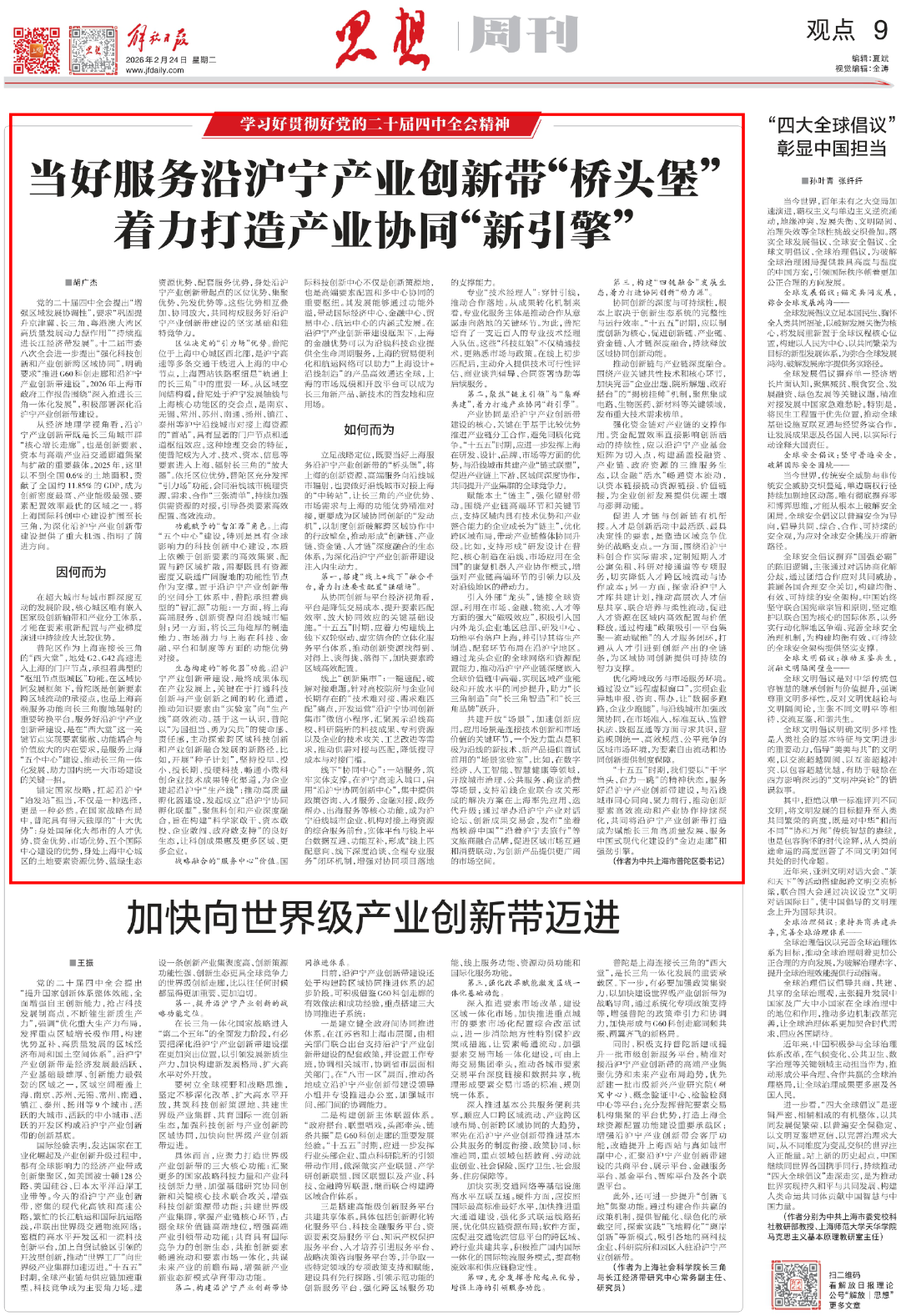 来源: 解放日报2026年2月24日,《解放日报》思想周刊“学习好贯彻好党的二十届四中全会精神”专栏刊发中共上海市普陀区委书记胡广杰署名文章《当好服务沿沪宁产业创新带“桥头堡”,着力打造产业协同“新引擎”》,全文如下。