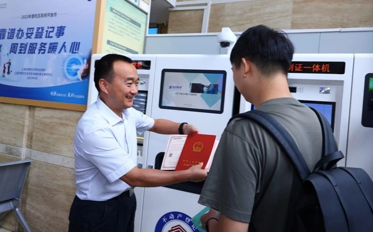当天,姜爱锋来到不动产交易登记大厅,与来自各行各业的公众代表零距离交流,全程陪同市民办理,亲切询问市民办事体验。企业客户林先生在陪同下办理了不动产登记过户一件事“立等可取”事项。他前期通过“一网通办”预约,线上递交申请材料并审核通过后,来到登记大厅办理缴税和领证,并使用不动产登记自助打证机当场打印出证。迅速取得产证的林先生兴奋地说:“没想到产证还可以自助打印,太方便了!”
