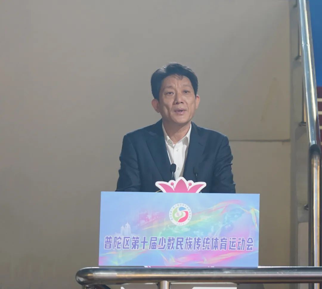陈昶在致辞中表示,普陀区民族传统体育运动会始终秉承“平等、团结、拼搏、奋进”的宗旨,至今连续举办了十届,促进了各民族的交往交流交融。普陀的民族体育事业在全区各族人民的共同努力下,奋发进取、开拓创新、屡创佳绩,呈现出蒸蒸日上的新气象。本届民族运动会的成功举办,必将对促进普陀区民族团结进步事业的蓬勃发展,推动铸牢中华民族共同体意识产生积极的影响。希望全体参赛运动员发扬拼搏精神,赛出水平、赛出风格、赛出团结,大力展示各民族的活力和风采,希望各族干部群众积极支持和参与,共同分享民族大团结的和谐氛围。