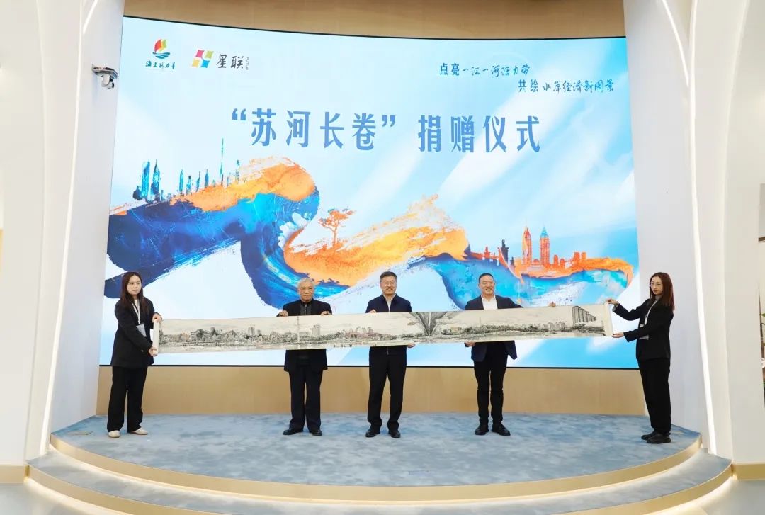 普陀区前美协主席、中国美术家协会会员、上海华侨书画院副院长、上海海上书画院副院长杨宏富先生创作的“苏河长卷”亮相活动现场。画作长达10米,通过充满力量感的笔触,展现了苏河魅力,未来这幅长卷将在新落成的半马苏河驿站展出。