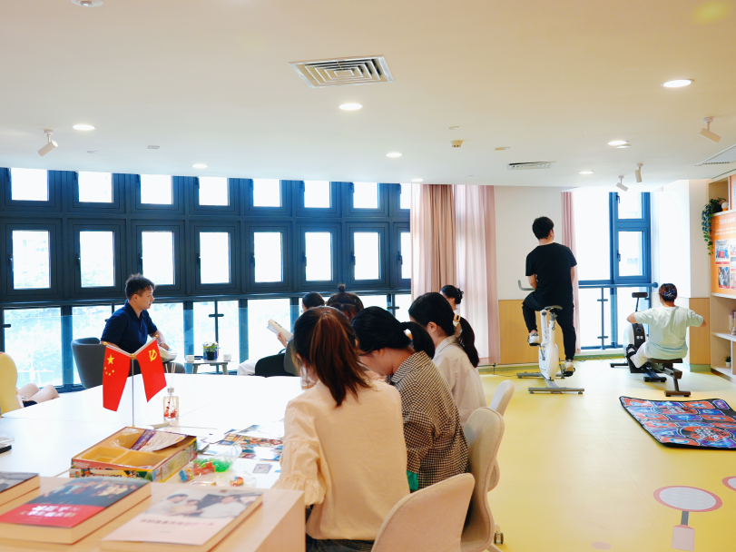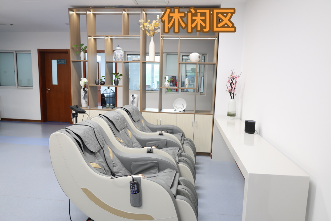 万里街道社区卫生服务中心职工工间休息室位于五楼南侧,以“两房两厅”概念设计,将党建文化、廉政文化和职工文化融为一体,提供学习、交流、休憩、健身等服务。