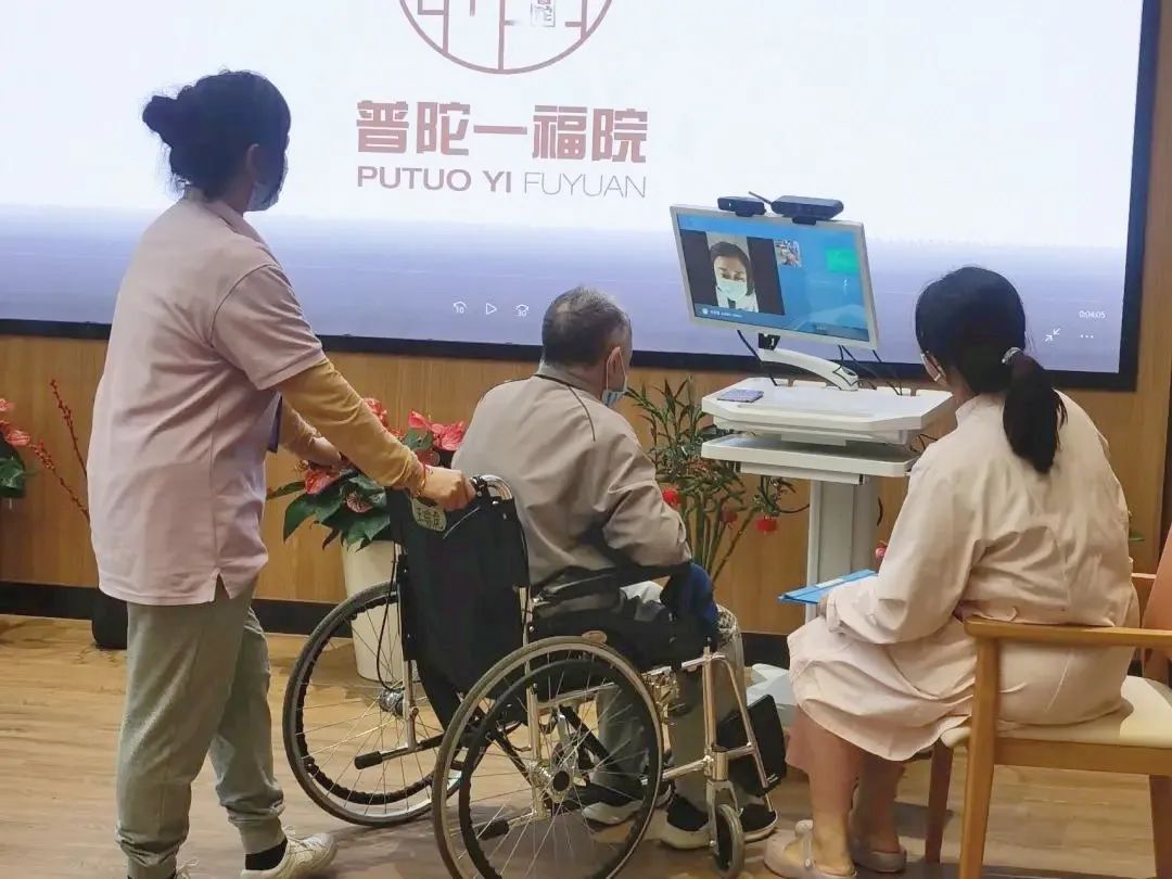 普陀区福利院和普陀区第一老年福利院的住养老人在线绑定医保卡后,就可以通过设备终端与普陀区中心医院互联网医院的医生沟通,进行在线复诊,医生开具处方,并在线完成医保结算。如此一来,养老机构内住养老人足不出户,即可享有“云端”线上复诊、专家咨询、用药咨询、护理咨询、线上开药、药品配送、医保支付等服务,真正让老人实现老有所养、老有所“医”。